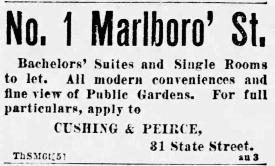 Also among the lodgers at 1 Marlborough from about 1896 were Charles Hayden Kip and George Burnap Morison. They previously had lived at 100 Chestnut. Both were graduates of the Harvard Class of 1883, where Charles Kip was one of the founders of the Harvard Cooperative Society in 1882 (which became the Harvard Coop store). He was sales agent for the American Mason Safety Tread Company. George Morison was a cotton and yarn dealer. He was a founder of the Boston Athletic Association in 1887 and served as its president from 1903 to 1915. Charles Kip and George Morison continued to live at 1 Marlborough in 1903 but had moved to 19 Marlborough by 1904.