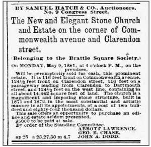 On October 25, 1881, the Boston Evening Transcript reported that Rev. G. C. Lorimer of Chicago would preach on October at the Brattle Square Church, commenting that the “acoustic properties of the church will be tested, and it is hoped that the services may lead to the purchase of the church by the Baptists.” On December 22, 1881, the Boston Post reported that the “First Baptist church on Shawmut avenue is discussing the purchase of the Brattle Street church edifice on Commonwealth avenue.” On January 4, 1882, the Boston Globe reported that the church had decided to purchase the building, subject to “certain conditions,” including “that the residents of the Back Bay shall subscribe from $40,000 to $50,000 towards the $90,000 for which the Brattle Square Church can be purchased, and this, it is believed, they will readily do.”