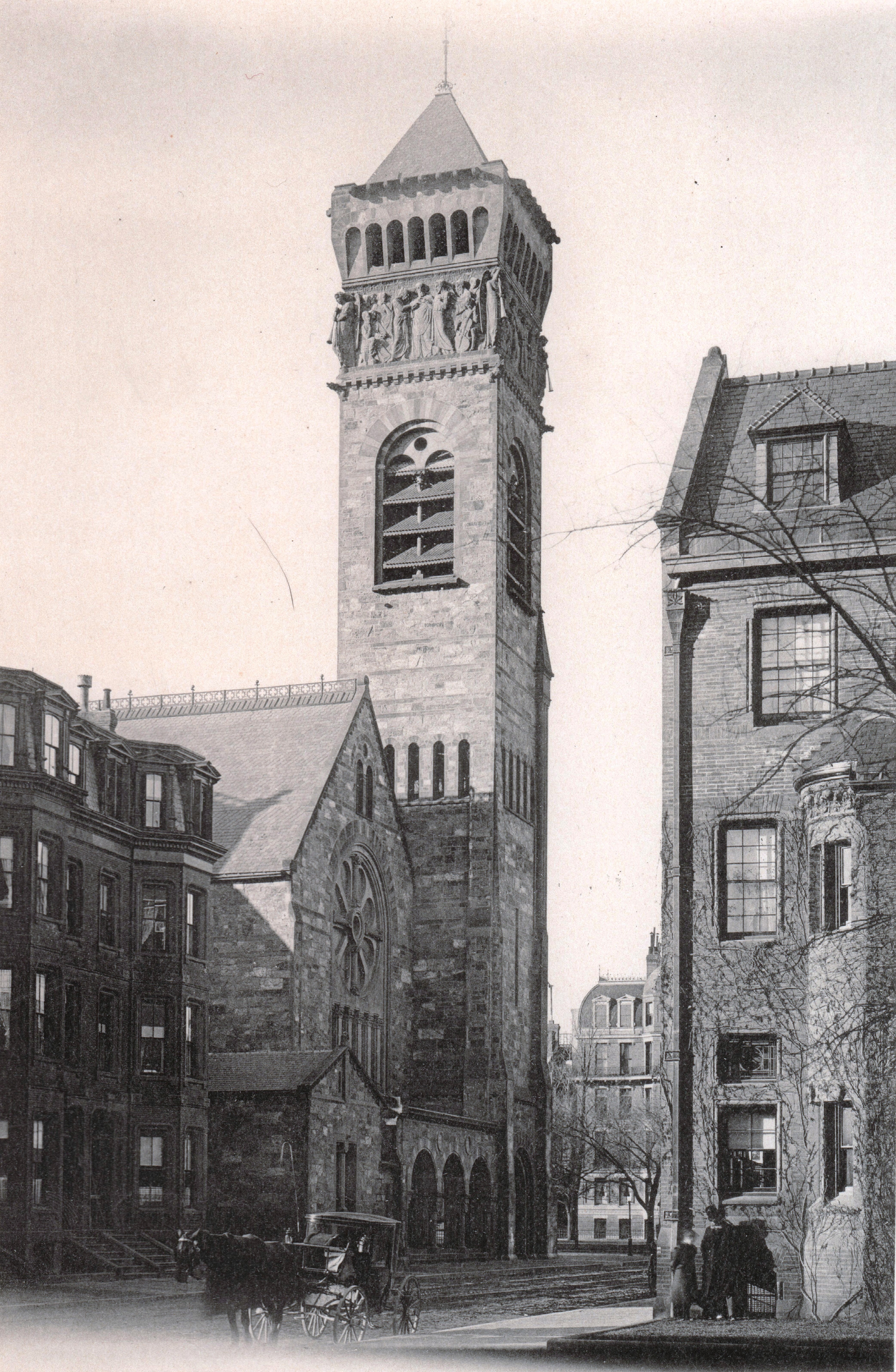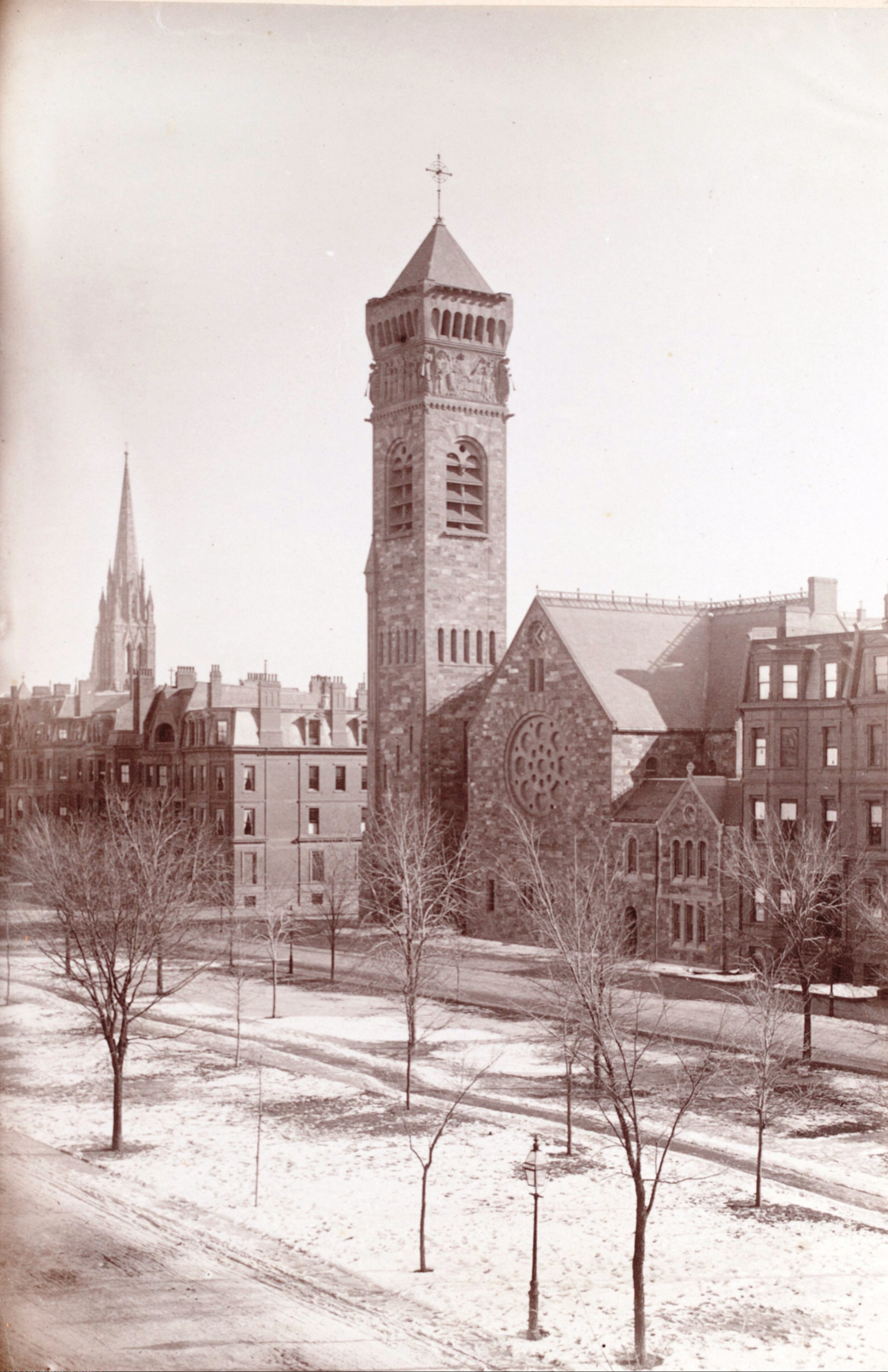 The congregation demolished their church on Brattle Street in 1872 and began meeting at the unfinished church on Commonwealth in the spring of 1873. A May 10, 1873, article from the Boston Globe commented that “the society that formerly worshipped in the old church in Brattle square have, for the past two Sabbaths, held services in the chapel room connected with the new church building now erecting at the corner of Clarendon street and Commonwealth avenue.”