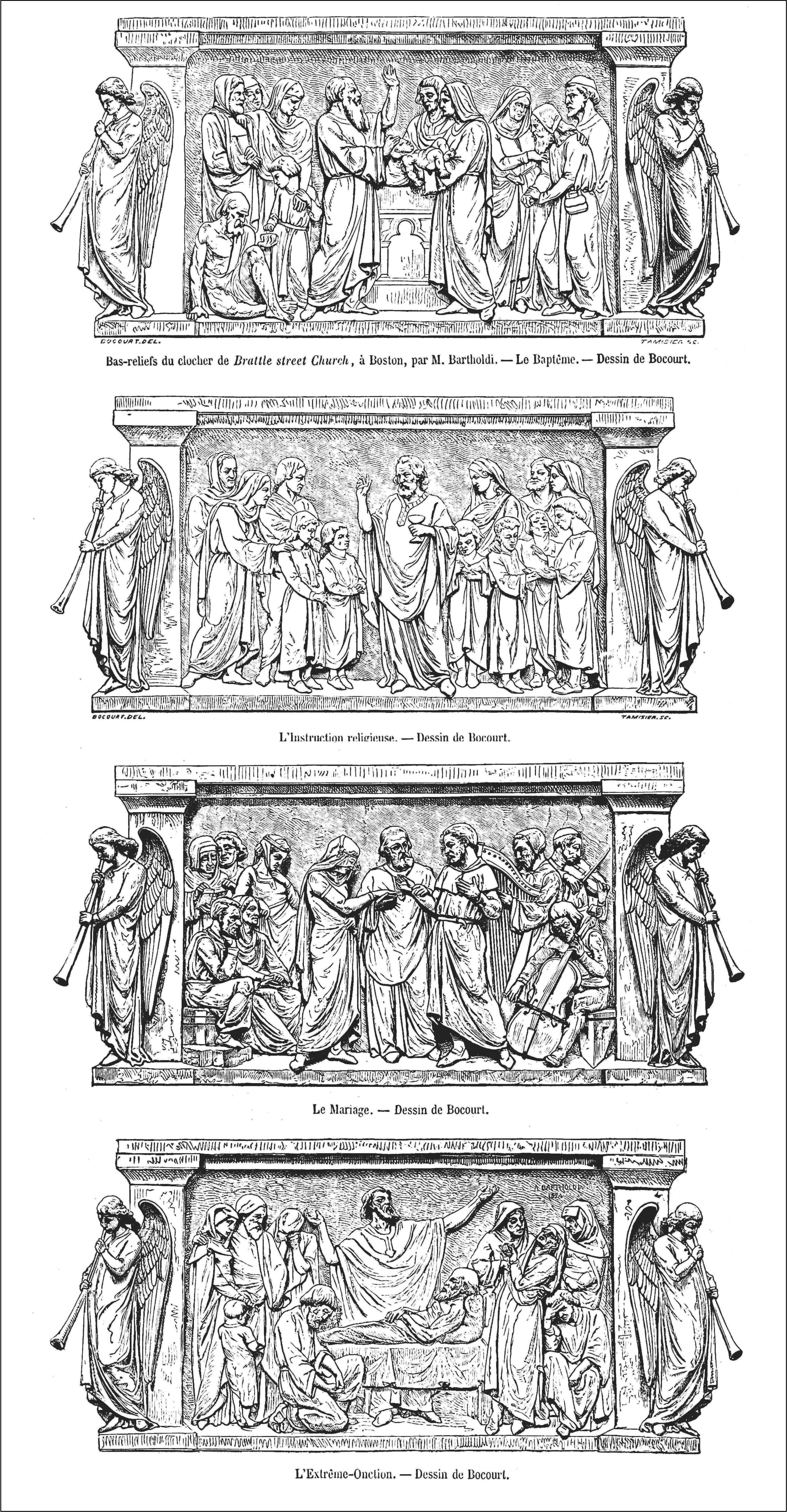 Baptism, Communion, Marriage, and Death: drawings of Bartholdi’s frieze for the Brattle Square Church; Le Magasin Pittoresque, 1876