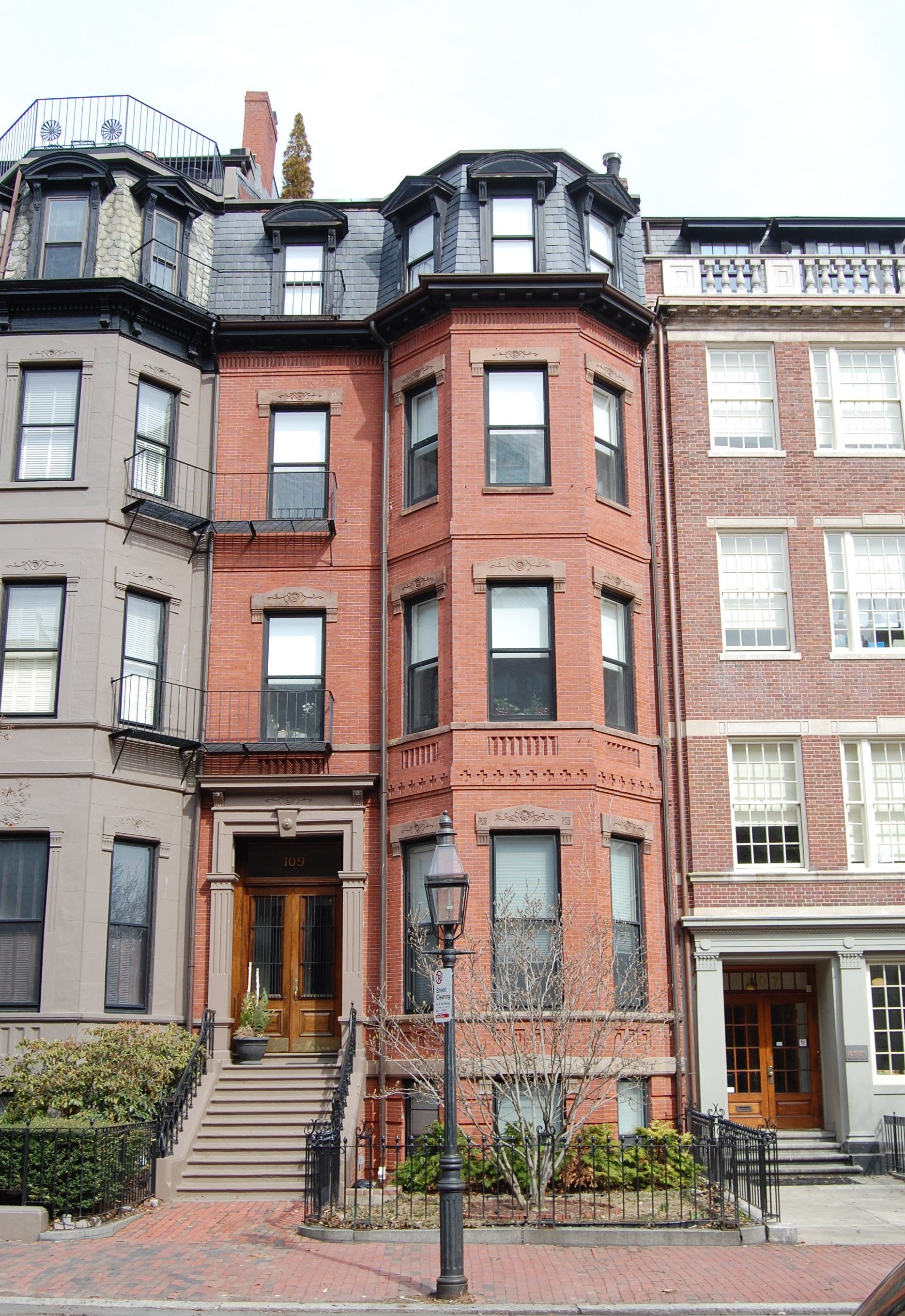 The façades of 109 Marlborough and 111 Marlborough are identical in design and detail, with the exception that 109 Marlborough is faced with brick and 111 Marlborough faced with brownstone.