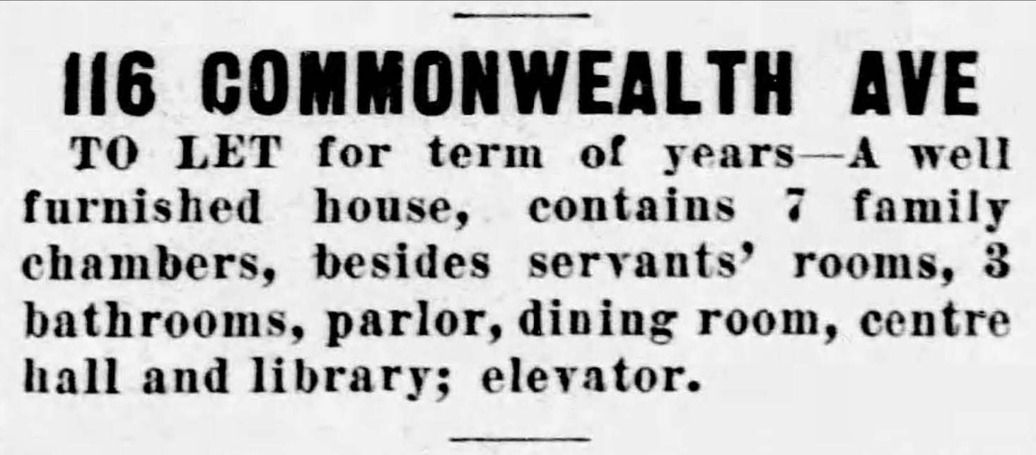 In May of 1872, I. & H. M. Harmon filed a Notice of Intention to build 116 Commonwealth (reported on May 25, 1872, in the Boston Traveller). Construction probably started soon thereafter.