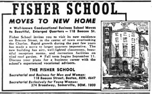 On June 22, 1939, 118 Beacon was purchased from Alice King’s estate by Fisher Business School (later Fisher College). The transaction was reported in the Boston Globe, which noted that 118 Beacon was “well known for its interior woodwork, paneling and flying staircase of polished marble,” and that the school would install “modern lighting and furnishings, including a cafeteria for student use.” Fisher Business School previously had been located at 30 Franklin and also maintained a campus in Somerville.
