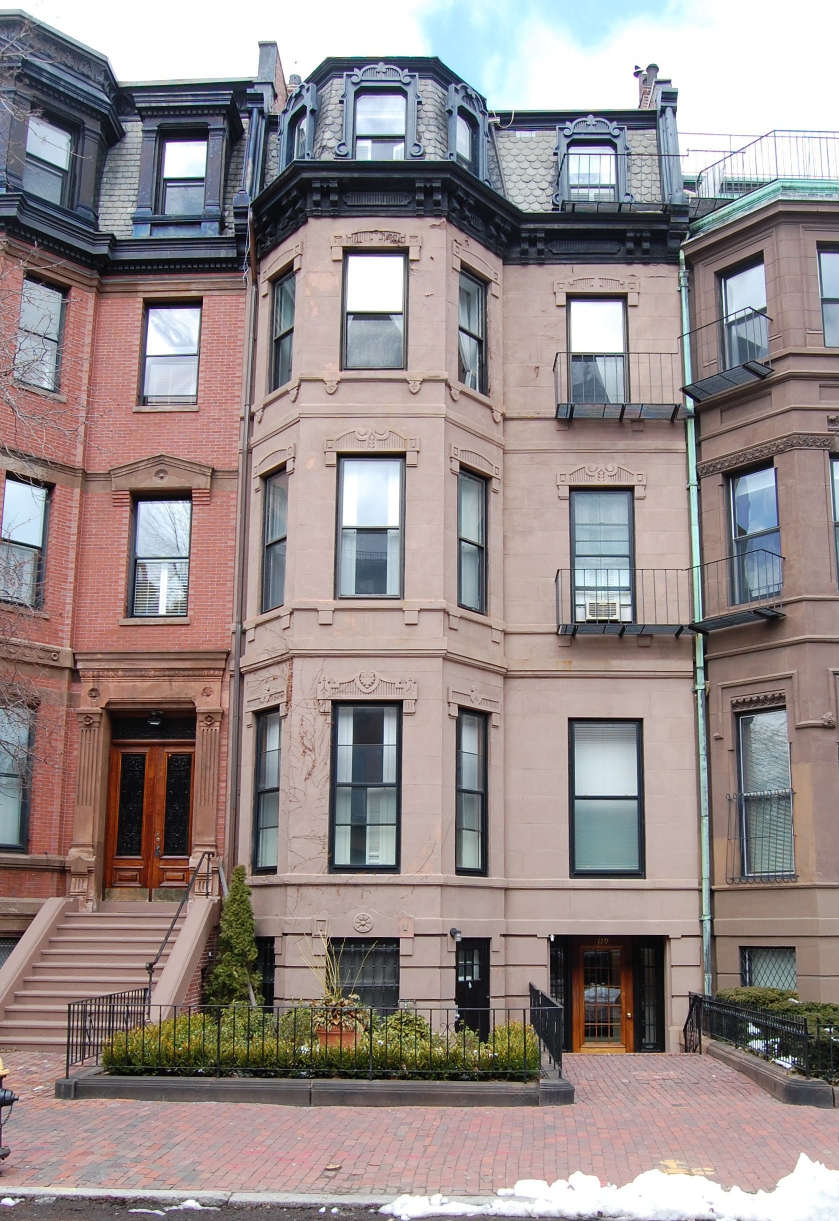 119 Marlborough is located on the north side of Marlborough, between Clarendon and Dartmouth, with 117 Marlborough to the east and 121 Marlborough to the west.