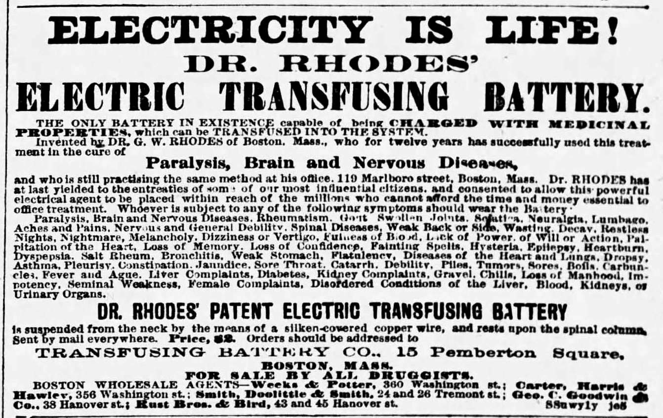 In June of 1880, George Rhodes advertised in the Boston Globe “Dr. Rhodes’ Patent Electric Transfusing Battery, the only battery in existence capable of being charged with medicinal properties which can be transfused into the system.” He claimed he had successfully used the battery for twelve years “in the cure of Paralysis, Brain and Nervous Diseases” and was “still practising [sic] the same method at his office, 119 Marlborough Street, Boston.”