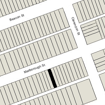 122 Marlborough is located on the south side of Marlborough, between Clarendon and Dartmouth, with 120 Marlborough to the east and 124 Marlborough to the west.