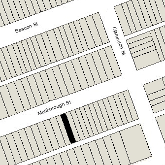 128 Marlborough is located on the south side of Marlborough, between Clarendon and Dartmouth, with 126 Marlborough to the east and 130 Marlborough to the west.