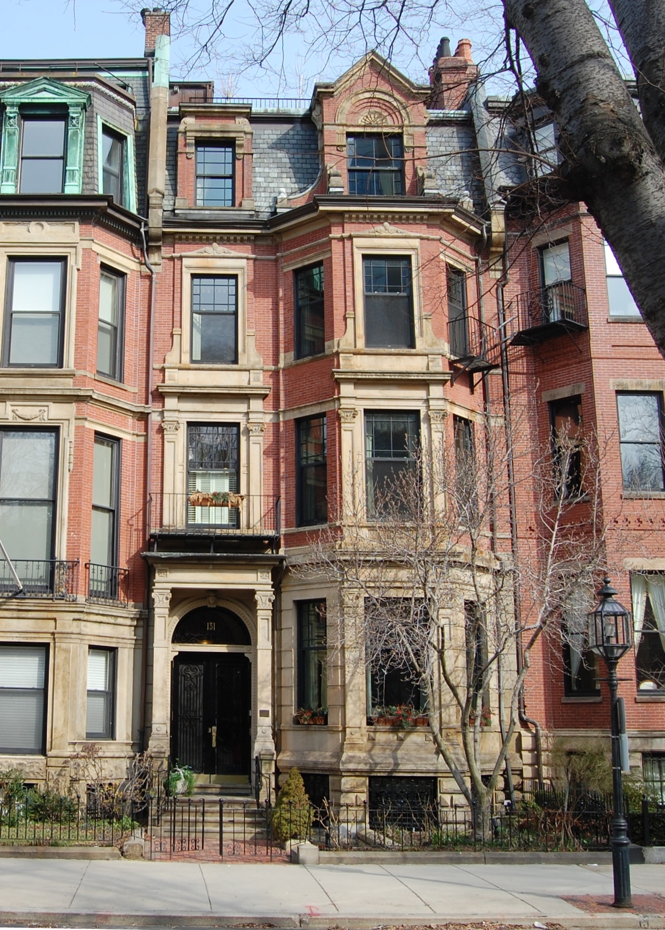 131 Commonwealth was designed by architect Carl Fehmer and built in 1880 by I. & H. M. Harmon, builders, as the home of insurance broker Gideon Scull and his wife, Anna Jertha Hedwig (Seiler) Scull. They previously had lived at 13 Mt. Vernon.
