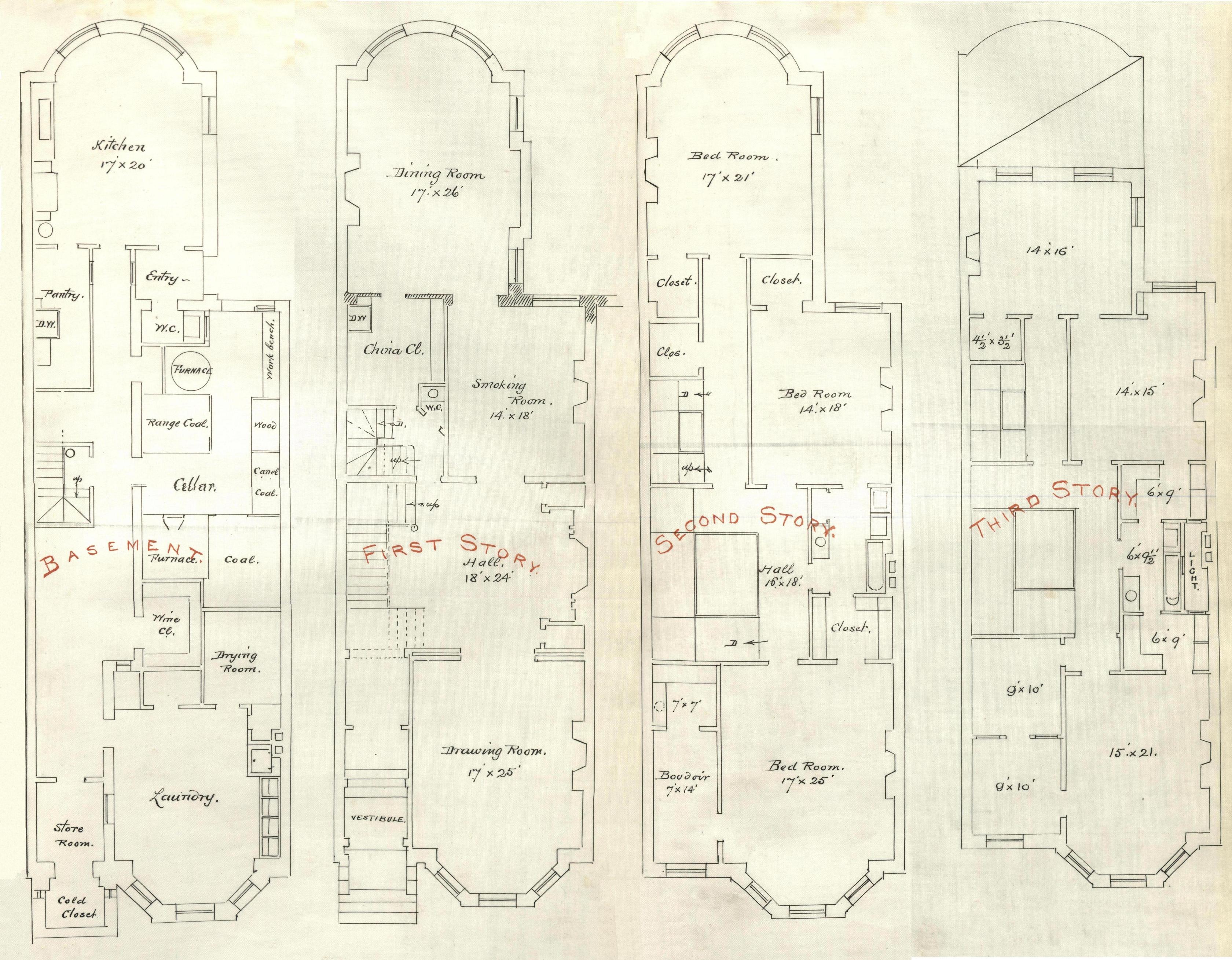 Basement and first through third floor plans of 131 Commonwealth, bound with the final building inspection report , 30Dec1880 (v. 1, p. 118); Boston City Archives