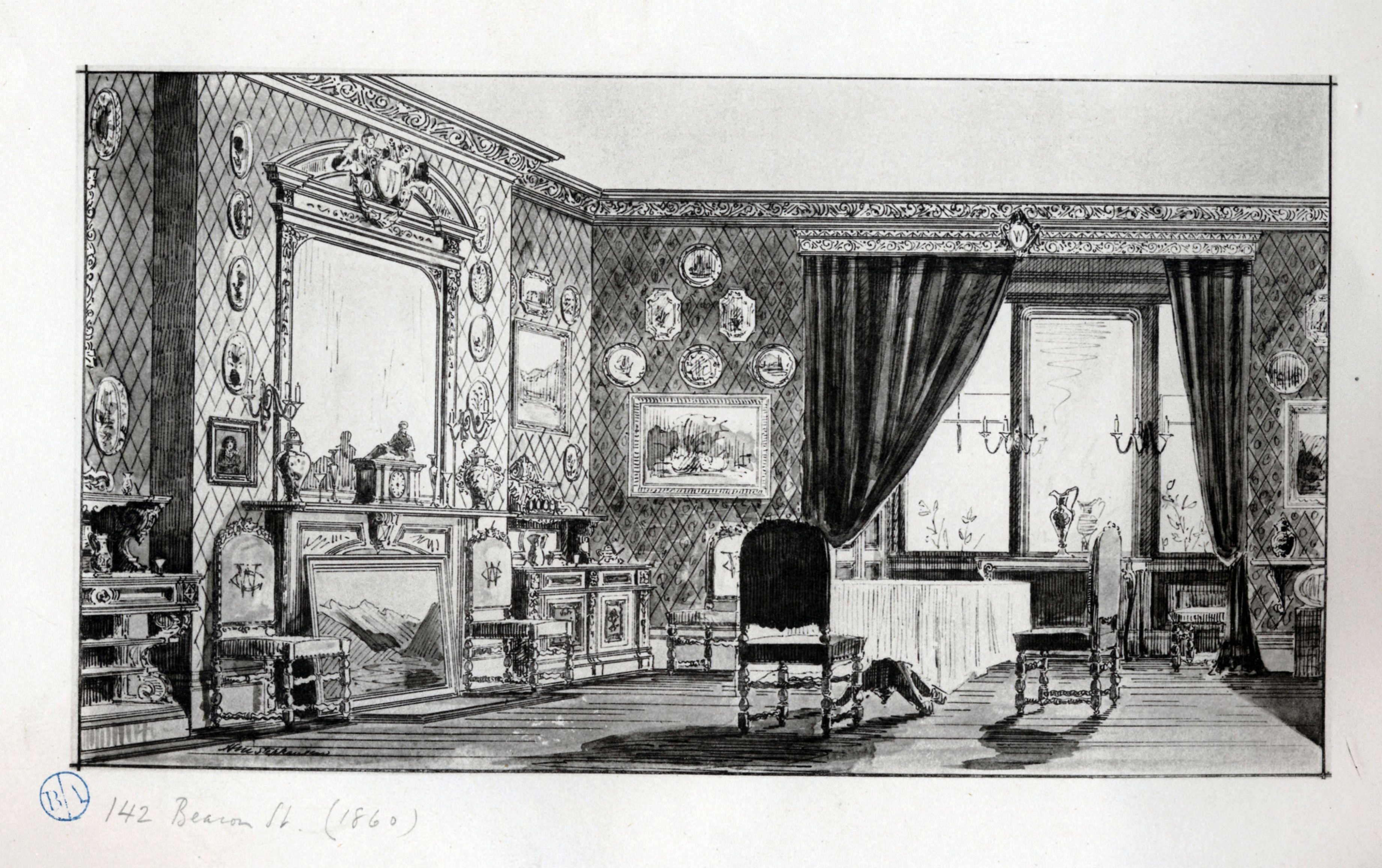 The dining room of 142 Beacon is illustrated and described in The Book of American Interiors, by Charles Wyllys Elliott, published in 1876. It is described as being 20 feet by 25 feet, with oak woodwork.