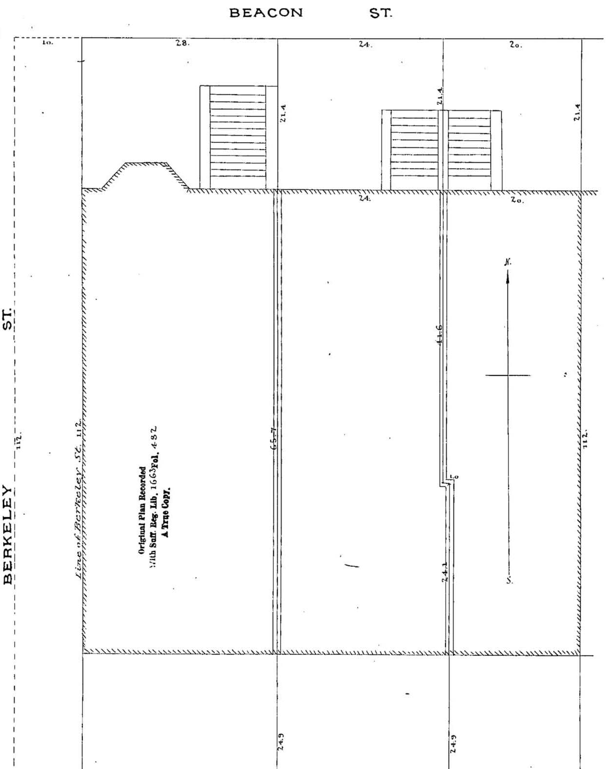 Plan of 143-145-147 Beacon showing party wall detail; Suffolk County Deed Registry, Book 1663, p. 482 (17Dec1884)