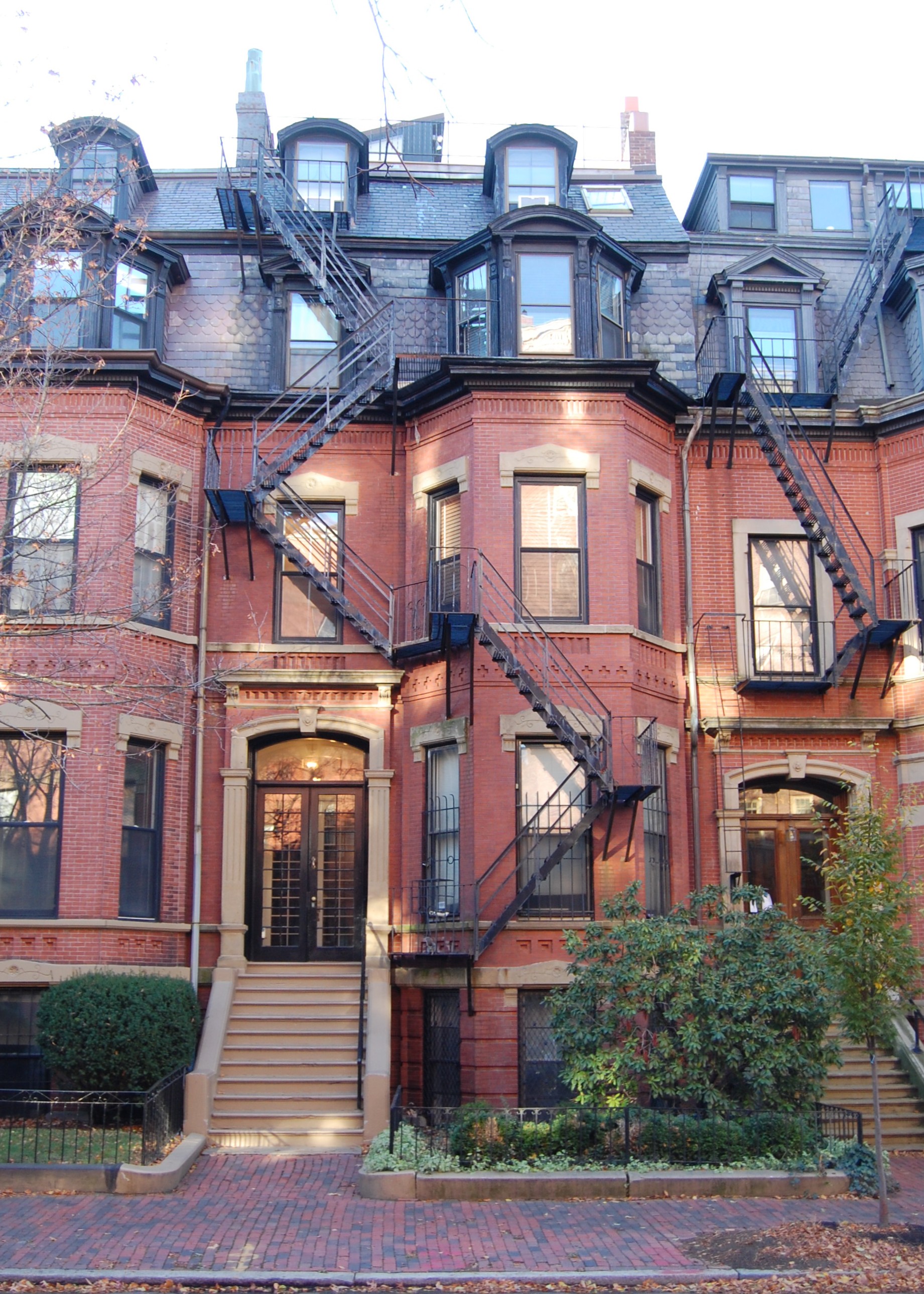 The five houses at 140-148 Marlborough were built on a 121 foot wide parcel that John Farrington acquired in three transactions: a 58 foot wide lot to the east on July 29, 1872, from Francis E. Parker; a 25 foot lot to the west on November 2, 1872, from Louisa (Bronson) Hunnewell, the wife of Hollis Hunnewell; and a 38 foot wide lot between the other two on April 15, 1873, from Joseph Washington Clark.