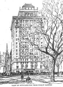 According to an August 31, 1926, article in the Boston Globe announcing the lease, the building would be completed with “some changes … to embody the Ritz service,” including a kitchen on each floor. It was to have 350 rooms, many of which would be suites.