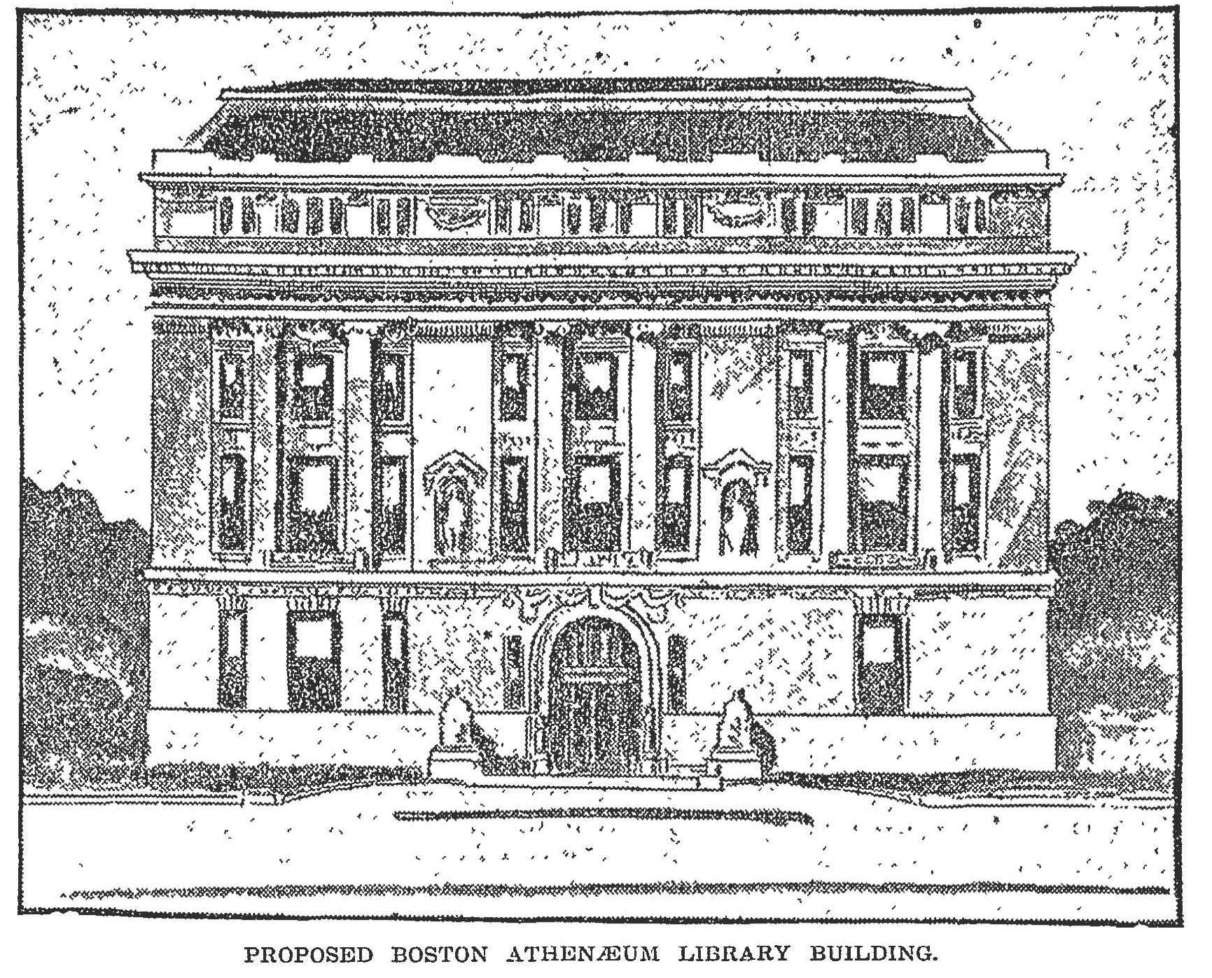Architect’s rendering of the Newbury façade of the proposed Boston Athenaeum Building at 13-15 Arlington; Boston Globe, 28May1902