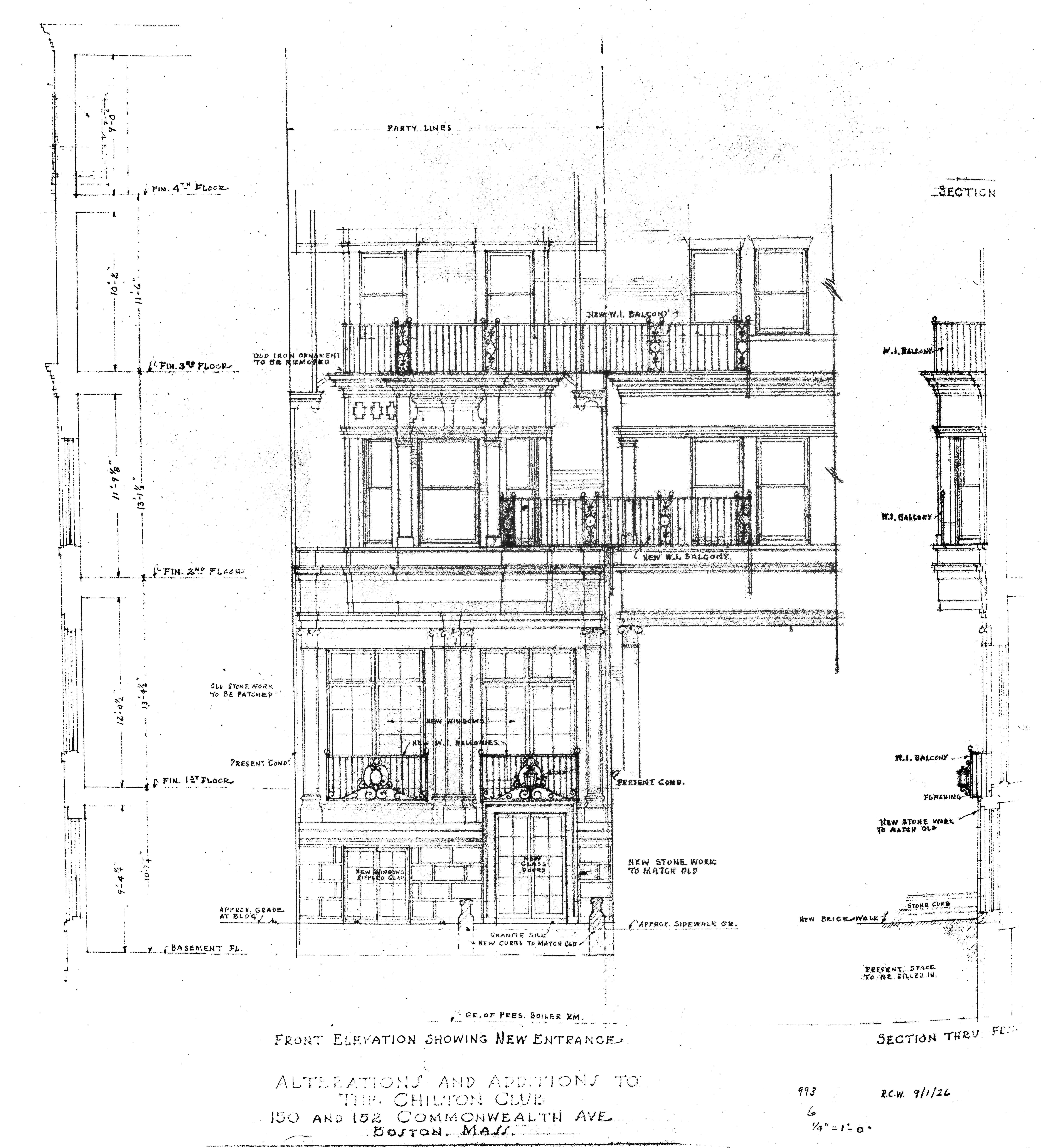 In September of 1926, the Club applied for (and subsequently received) permission to remodel 150 Commonwealth, including lowering the front entrance and making various interior modifications to consolidate it with the Club’s property at 152 Commonwealth. The plans also included adding a rear ell which subsequently was was not built. The work was designed by William Bigelow of Bigelow and Wadsworth. Plans for the remodeling — including elevations and floor plans — are included in the City of Boston Blueprints Collection in the Boston City Archives (reference BIN P-24).