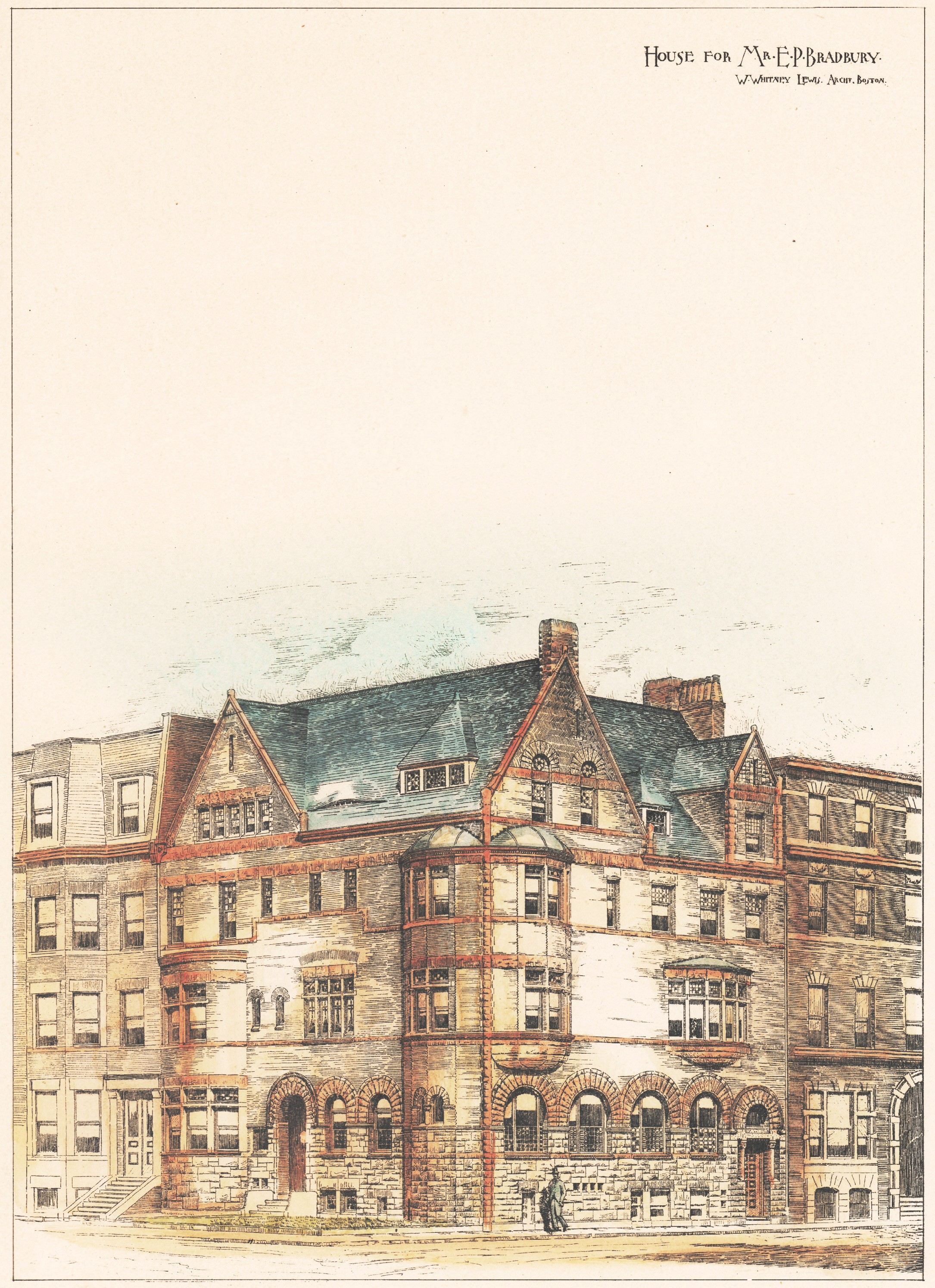 16 Exeter (196 Marlborough) was designed by architect William Whitney Lewis and built in 1886 by James Smith and William Wood, builders, for Dr. Edwin Perley Bradbury, a dentist, and his wife, Louisa Selby (Jordan) Bradbury. They previously had lived at 124 Commonwealth.