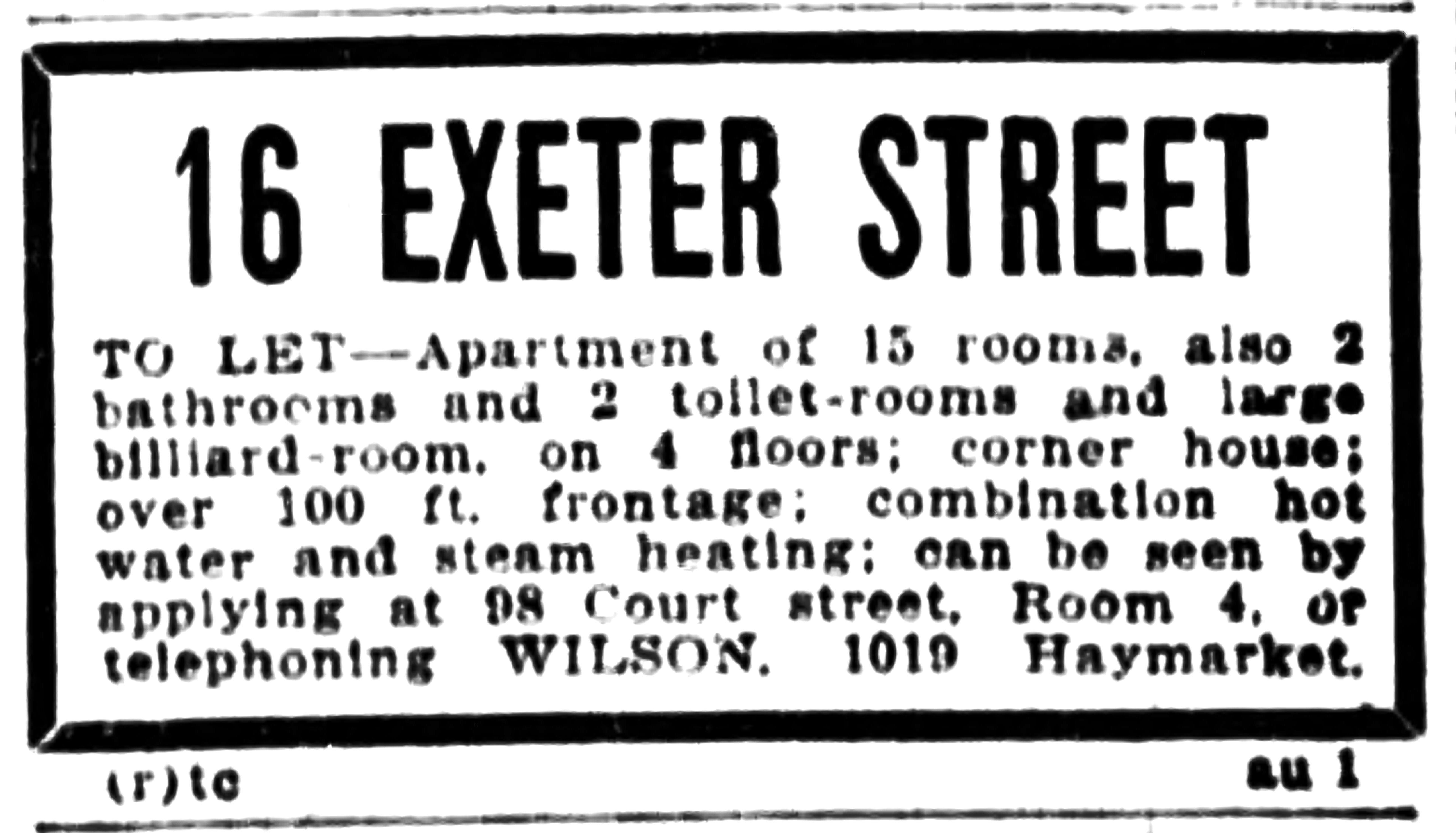 By 1933, 16 Exeter was a multiple dwelling, probably a lodging house.