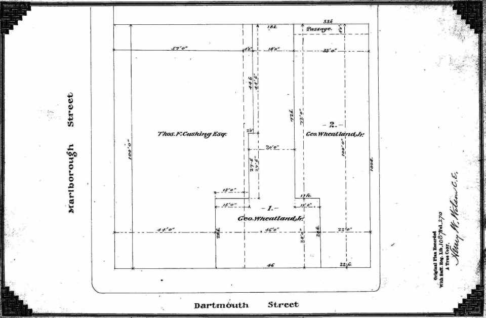 Deed 1087-270 (1872 Plan – 326 Dart) ← Previous Plot plan of 163 Marlborough and 326-328 Dartmouth, filed with mortgage of 326 Dartmouth’ Suffolk Co. Deed Registry, Book 1087, p. 270 (16Jun1872)