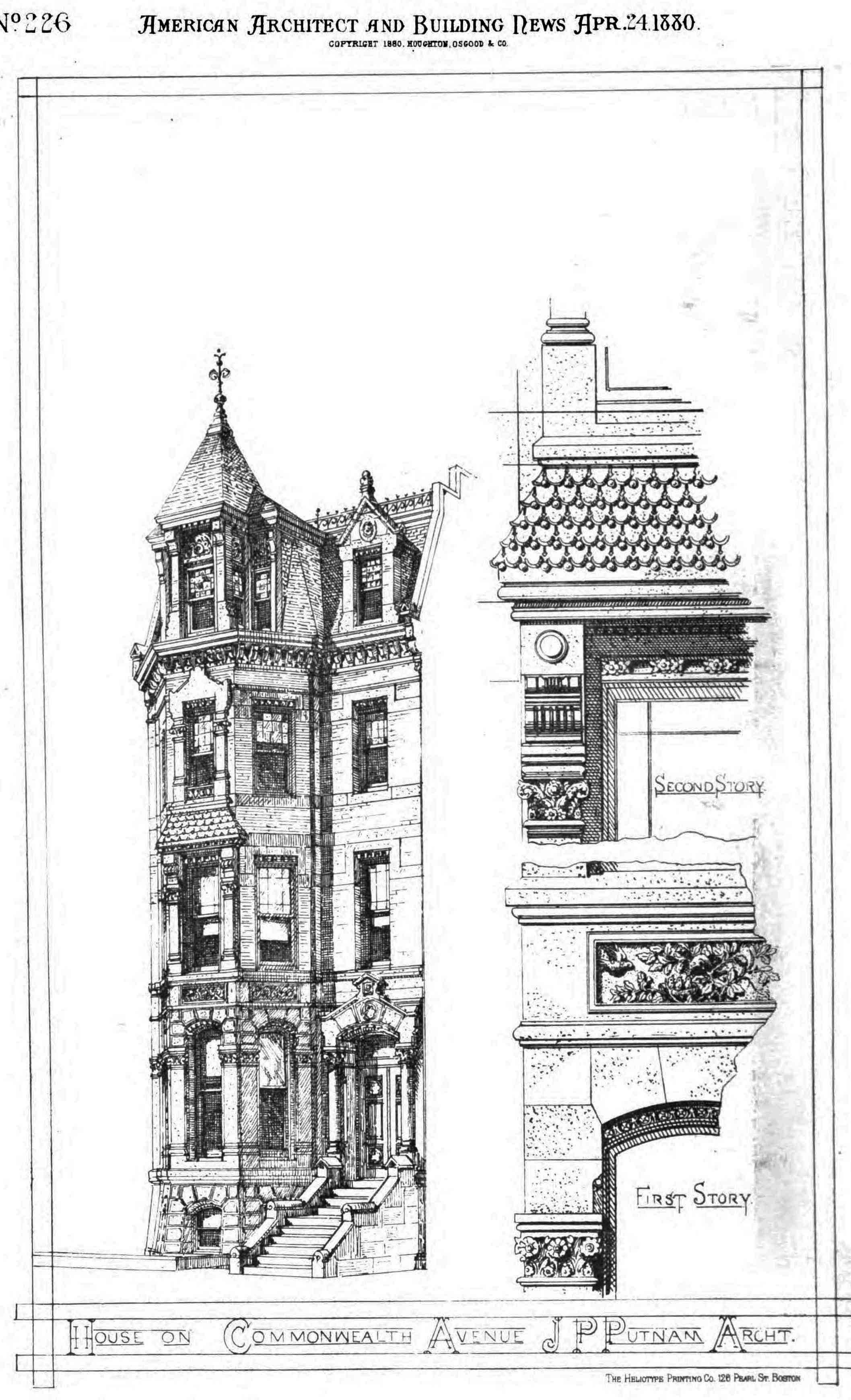No architect is named on the permit application for 165 Commonwealth. Bainbridge Bunting’s Houses of Boston’s Back Bay (page 202) indicates that the house probably was designed by Cummings and Sears. However, a drawing of the house in the April 24, 1880, issue of the American Architect and Building News, shows the architect to be J. Pickering Putnam.