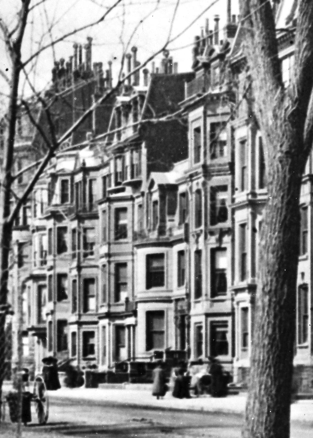 173-177 Commonwealth (ca. 1904), showing 175 Commonwealth before it was remodeled; detail from photograph of the Commonwealth Avenue Mall; courtesy of the Massachusetts Historical Society, Arthur Asahel Shurcliff Collection of Glass Lantern Slides #6.19.87