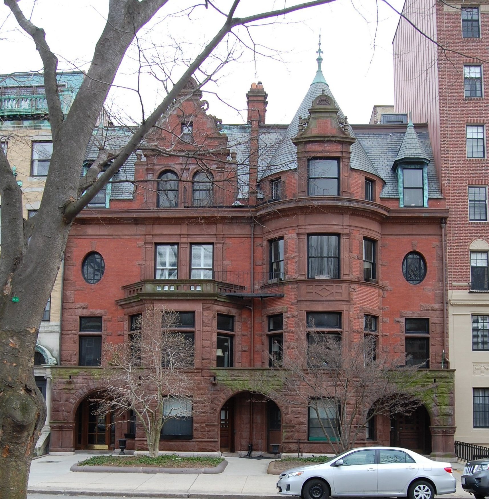 176 Commonwealth was designed by architect Charles Atwood and built in 1883-1884 by Benjamin F. Dewing and Morton & Chesley, builders, one of two contiguous houses (176-178 Commonwealth) designed as a symmetrical pair with lower stories in the Romanesque style and the dormer pediments in a Flemish style.