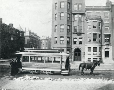 The Marlborough Street horse car line had small cars painted pale blue and pea green, affectionately known by residents as the “blue jays” or the “little blue cars.” The horse cars began at Massachusetts Avenue, with one line running east to Dartmouth and then south on Dartmouth to Boylston, and the other running east to Arlington, then north to Beacon and east on Beacon to Charles Street.