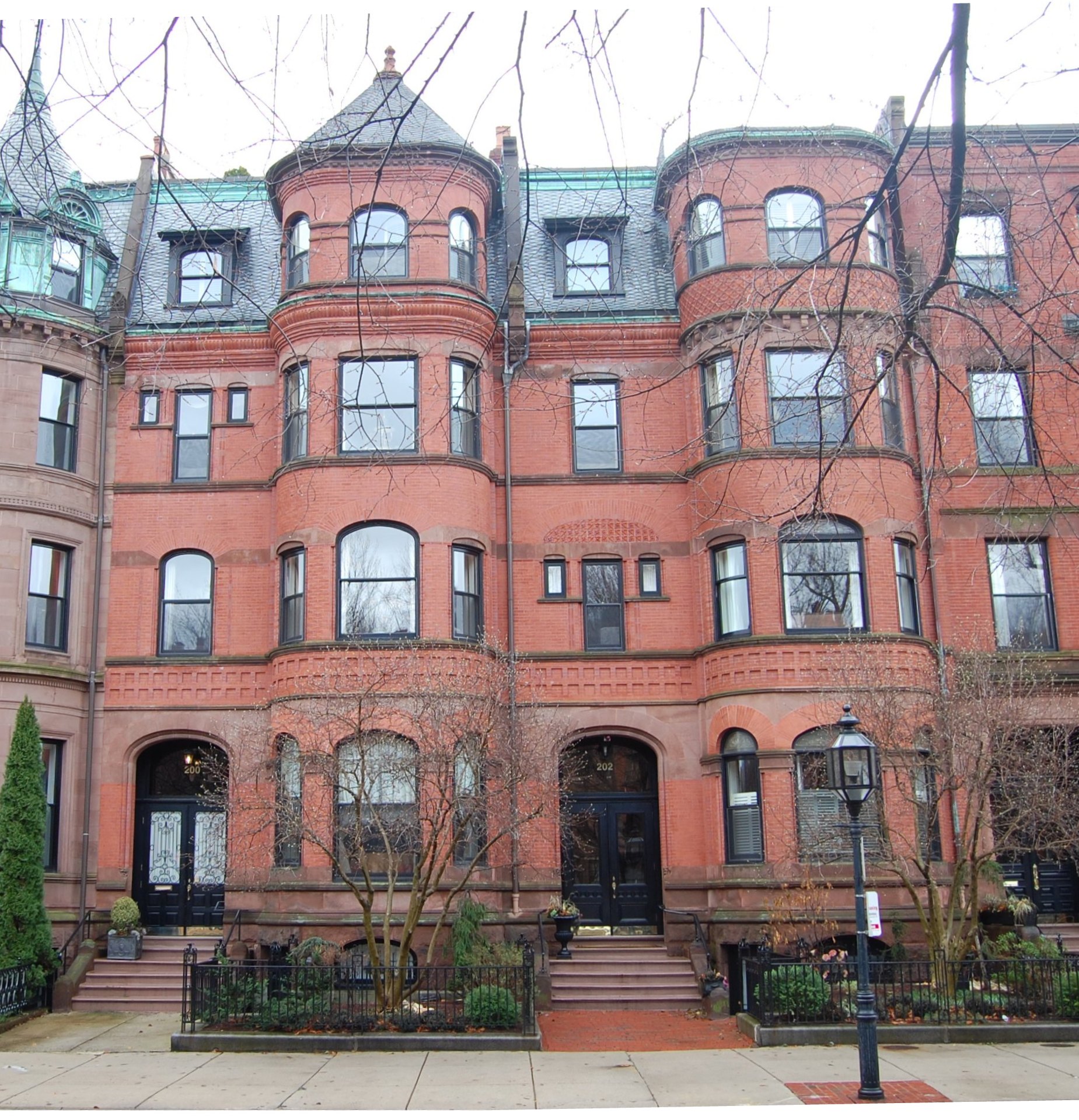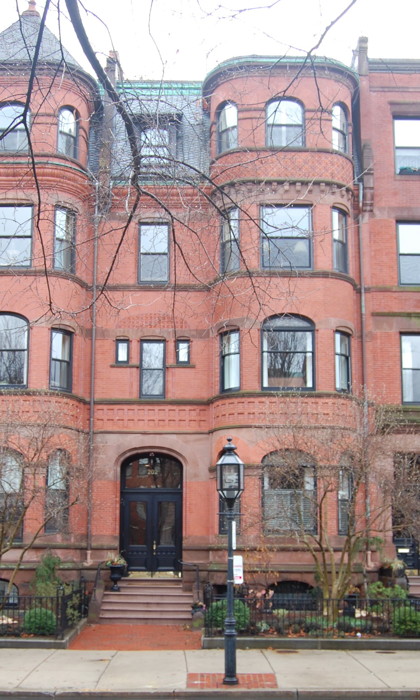 202 Commonwealth was designed by Allen and Kenway, architects, and built in 1882-1883 by Leander Greeley, carpenter, and James Smith, mason, one of two contiguous houses (200-202 Commonwealth) with unusual rectangular bays with curved sides topped with conical roofs (the conical roof at 202 Commonwealth has been removed).