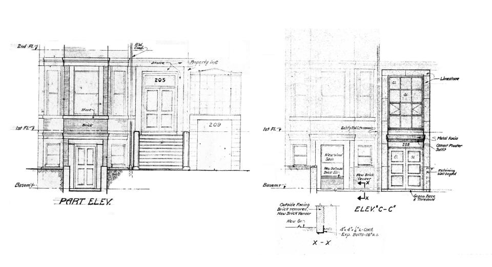 Architectural rendering of the front entrance to 205 Beacon as it existed in 1950 and as it was proposed to be remodeled, from plans by architect Archie Riskin; courtesy of the Boston Public Library Arts Department, City of Boston Blueprints Collection