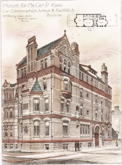 21 Fairfield (243 Commonwealth) was designed by architect William Whitney Lewis and built in 1880-1882 by Standish & Woodbury and John Morrison, builders. It was built as the home of iron and steel manufacturer George Parsons King and his wife, Sarah Williams (Lothrop) King. They lived at the Hotel Vendome while it was being built.