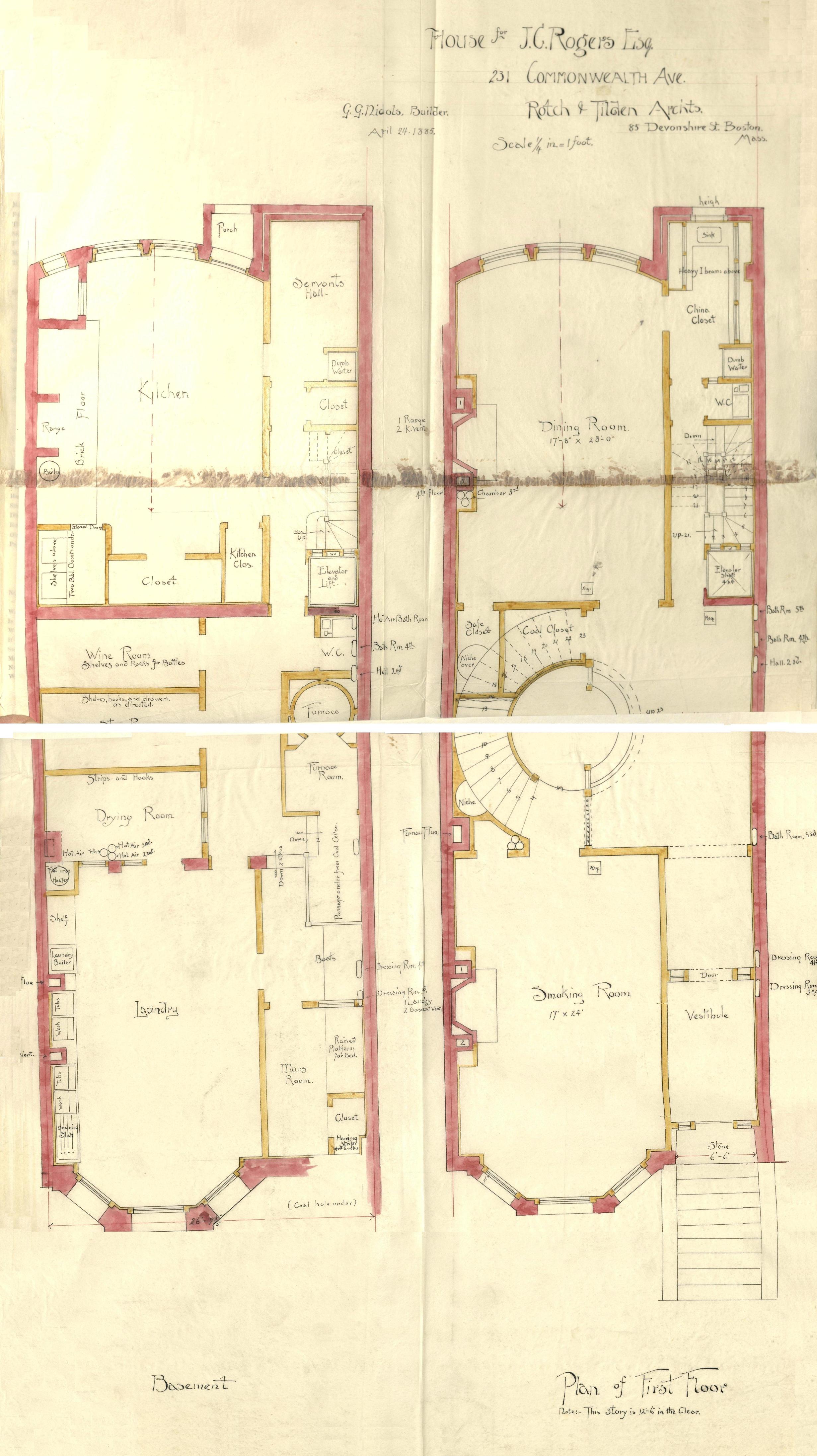 Basement and first floor plans of 231 Commonwealth, bound with the final building inspection report , 1Dec1886 (v. 16, p. 104); Boston City Archives