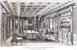 The dining room at 234 Beacon was illustrated in the March 8, 1879, issue of the American Architect and Building News. The accompanying description notes that the room has been designed to increase its “apparent size, by opening the bay-window more completely into it” and by designing the ceiling “to encourage the idea of the extension of the area of the room into this bay.” The ceiling beams were made of butternut wood and, like the library, enclosed elaborately painted panels.