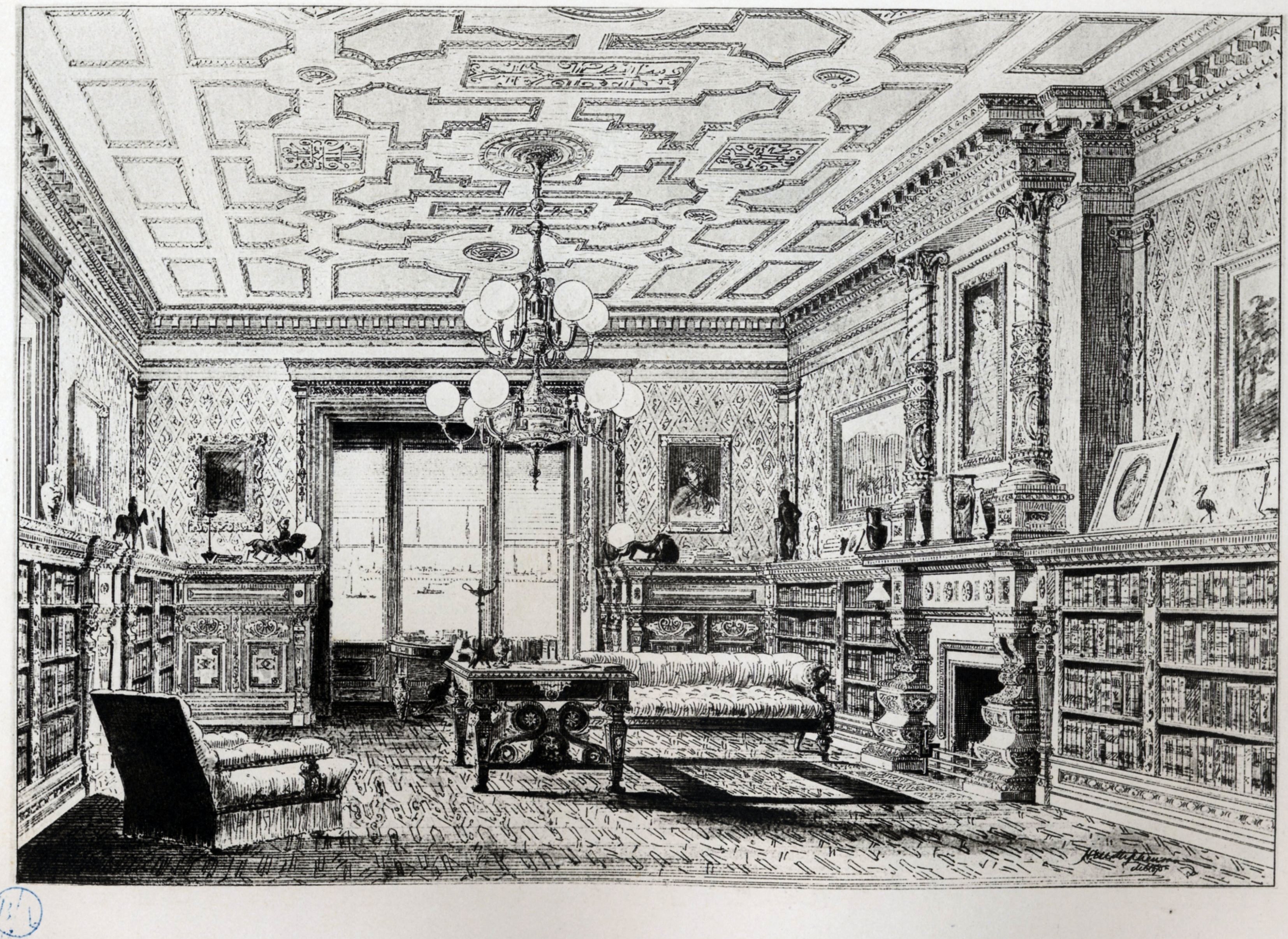 The library at 234 Beacon is illustrated and described in The Book of American Interiors, by Charles Wyllys Elliott, published in 1876. In the description, the room is said to be 33 feet long and 23 feet wide, with an exceptional mantel-piece and an elaborately decorated ceiling divided into panels in the “Elizabethan” style.