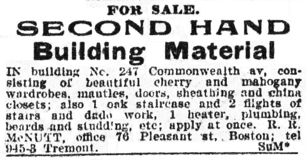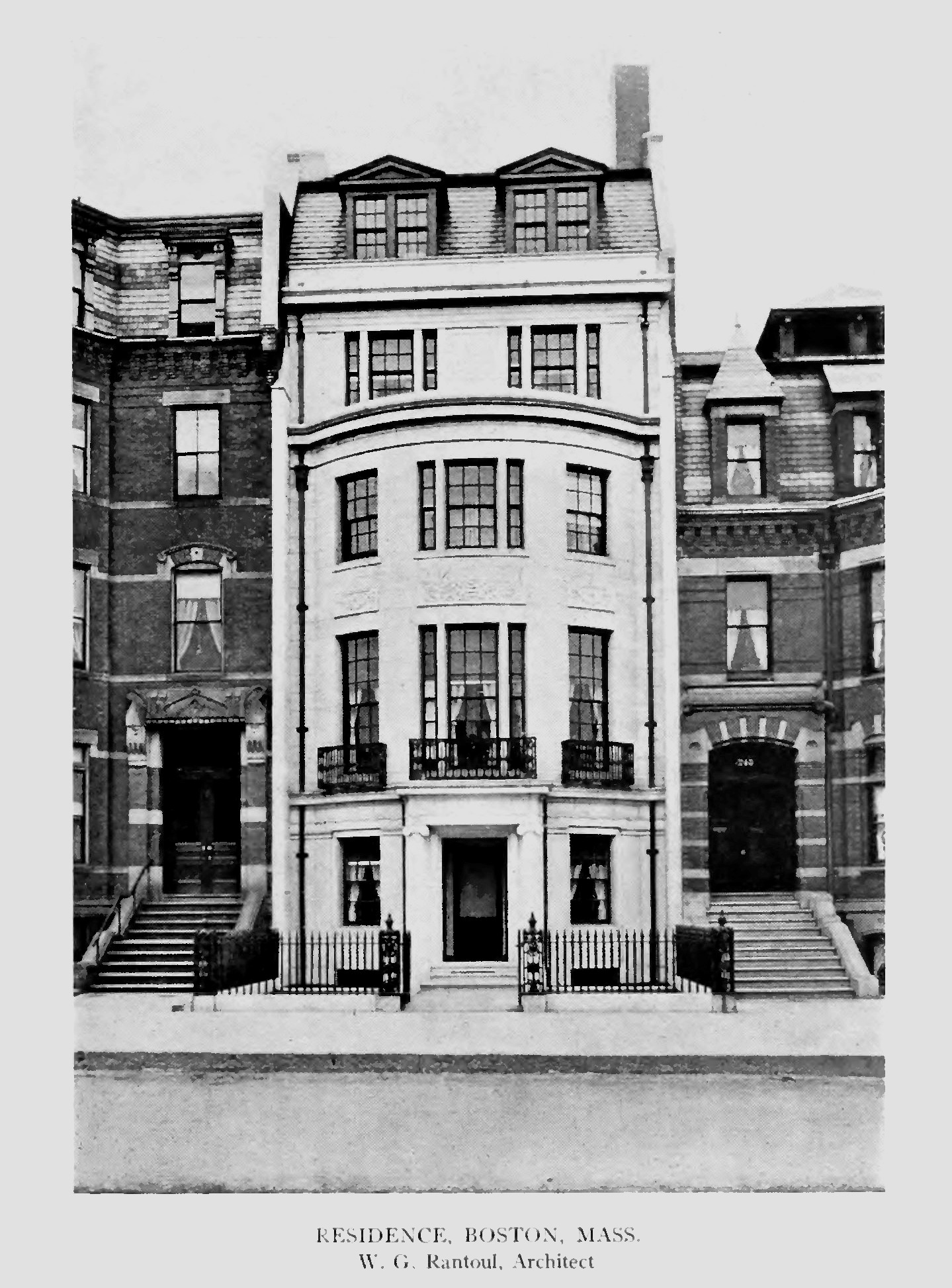 The Mandells had 247 Commonwealth rebuilt, including a granite façade with a bow across the entire front, designed by architect William Rantoul. Architectural plans for the rebuilding — including front and rear elevations, floor plans, framing plans. and piling plans — are included in the City of Boston Blueprints Collection in the Boston City Archives (reference BIN A-68).