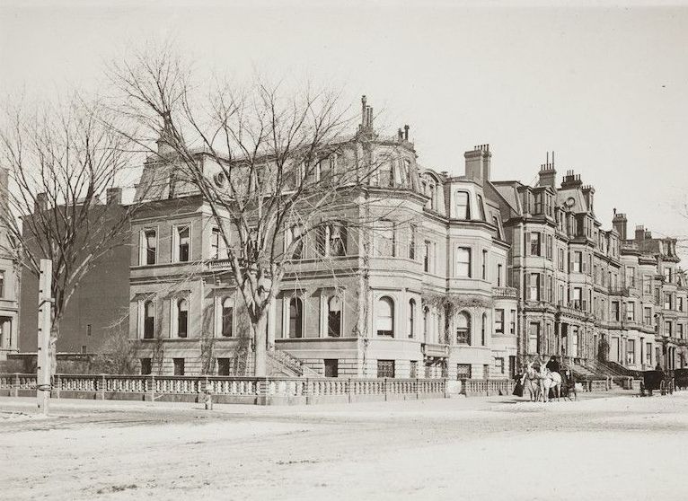 A black and white view of houses along Commonwealth Avenue seen from the intersection of Commonwealth Avenue and Berkeley Street. In front of one house is a horse drawn carriage with driver, and in the distance other carriages can be seen. The photograph appears to have been taken during the winter; there is a small amount of slush on the ground and the trees are bare of leaves.