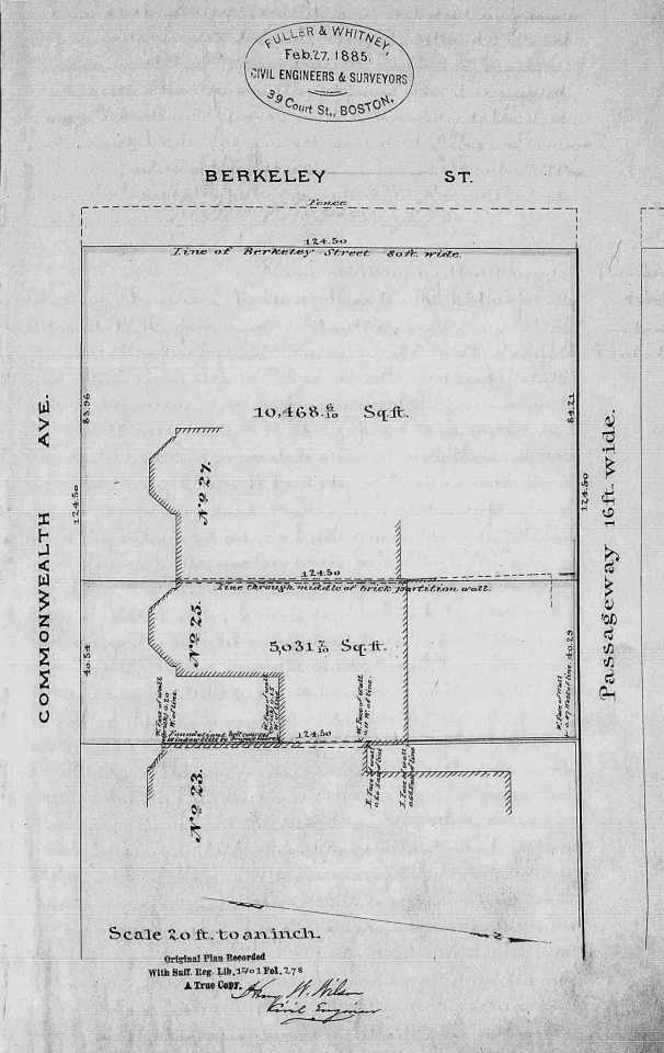 Deed 1701-278 (1885 Plan – 25-27 Comm) ← Previous Next → Plan of 25 Commonwealth by Fuller and Whitney (27Feb1885), Suffolk County Deed Registry, Book 1701, p. 278