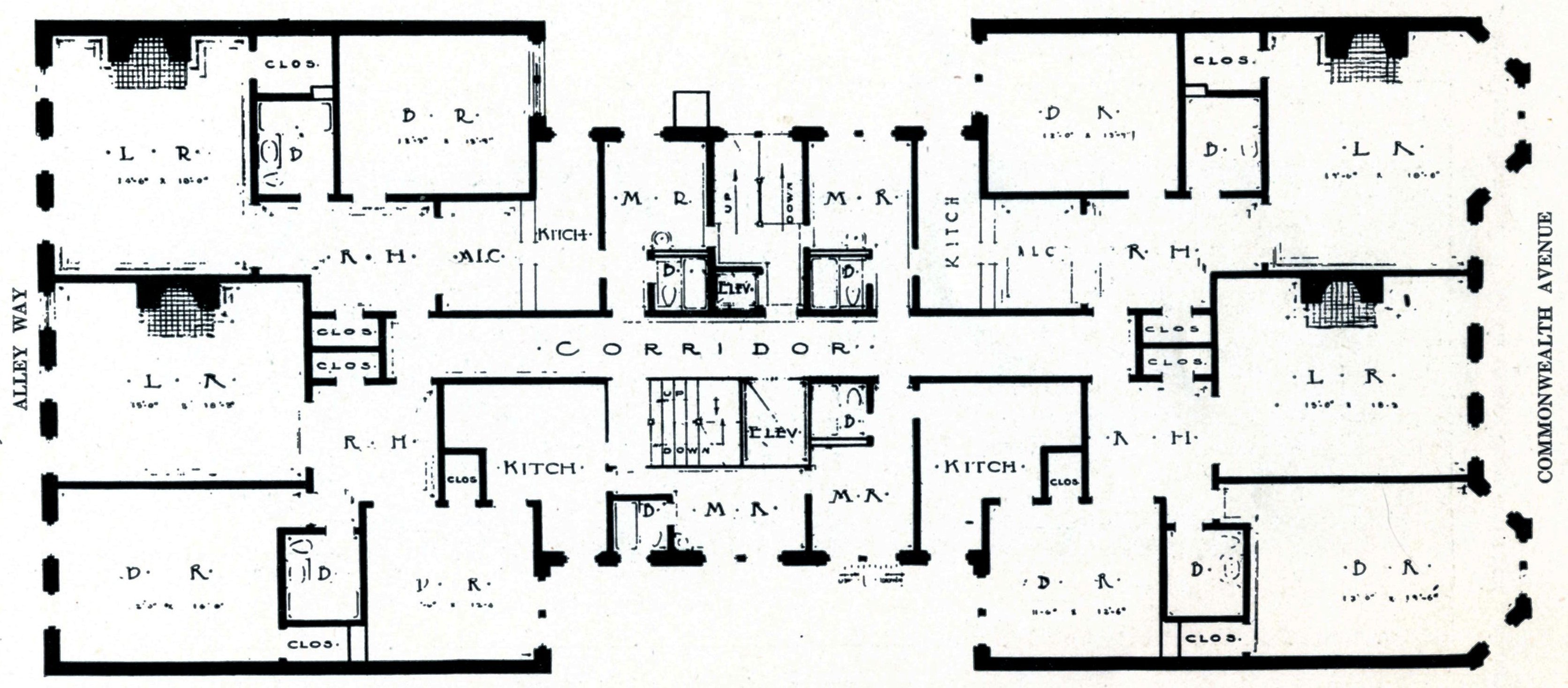 Floor plan of 250 Commonwealth ca. 1928, with four apartments per floor; rental brochure from T. Dennie Boardman, Reginald Boardman, and R. deB. Boardman