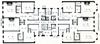 The original permit application indicated that the building would contain twenty apartments plus a janitor’s suite in the basement. By 1927 — and probably as built — it was a twenty-two unit building.