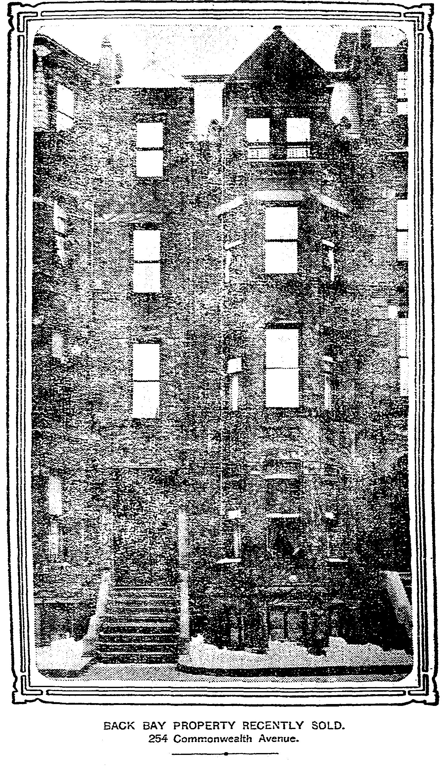 On January 20, 1905, 254 Commonwealth was purchased from William Rust and the Rusts’ four children (Frances I. Rust, Amelia Rust, Winifred Rust, and Philip S. Rust) by real estate investor George Theodore Cruft. He was unmarried and lived at 433 Shawmut.