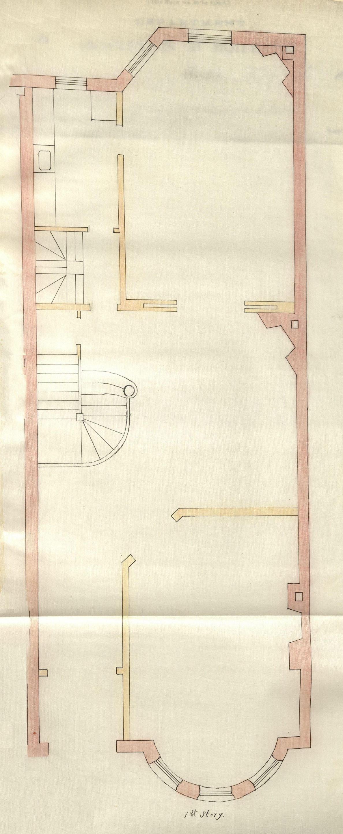 First floor plan of 258 Marlborough, bound with the final building inspection report, 9May1888 (v. 23, p. 105); Boston City Archives