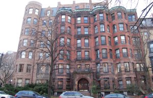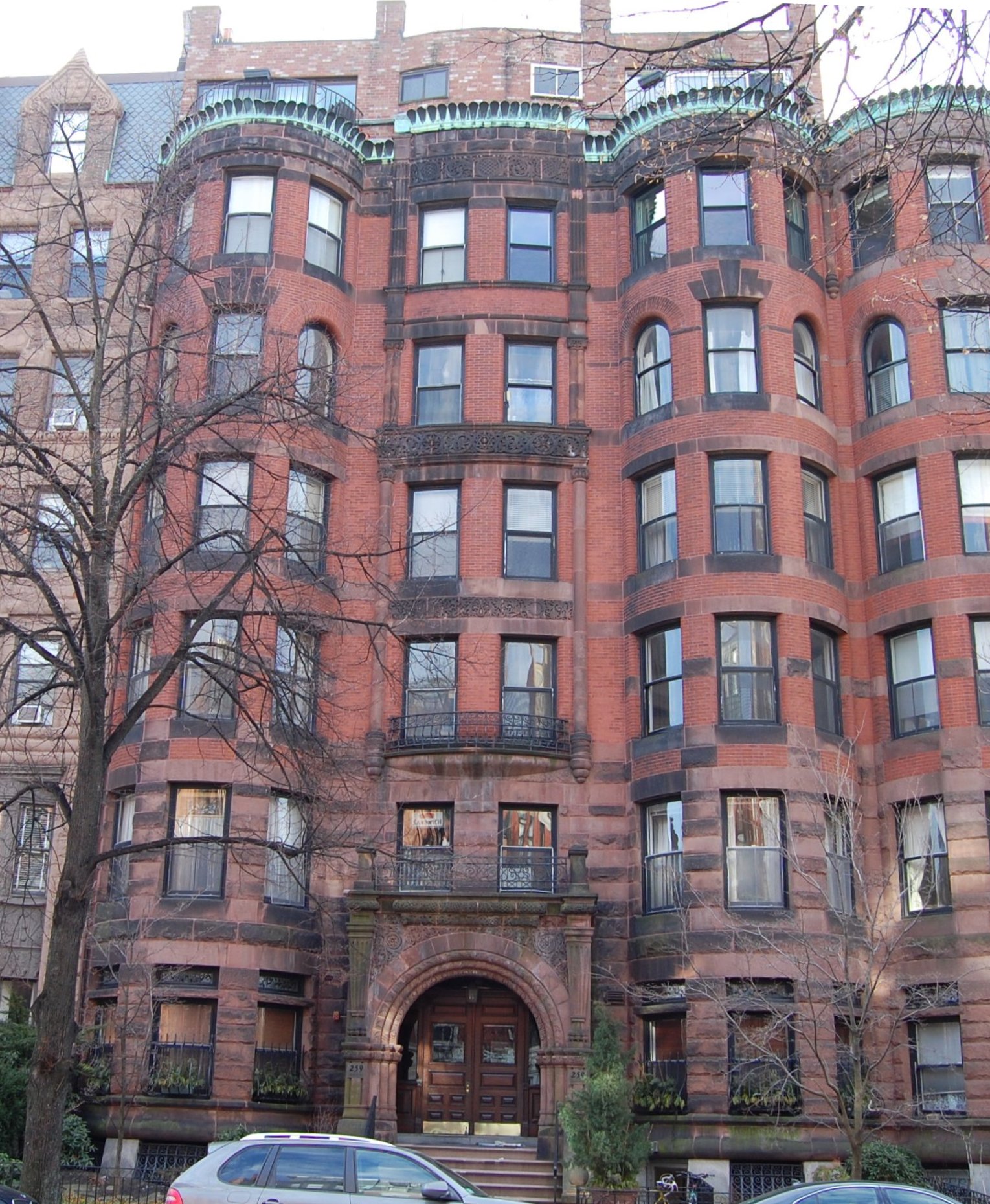 On June 8, 1889, the Boston Globe reported on 259-261 Beacon, which were expected to be completed on October 1. “P. Graffam, owner and builder, is erecting upon three lots of land on the southerly side of Beacon street, just west of Dartmouth street corner, a large and costly stone and brick apartment house, to contain 18 suites, with eight rooms and bathroom to each. …Upon every story will be three swell fronts, the first and second stories being of Longmeadow stone, split finish, with a wide hammered belt course, finely chiselled in ornamental carving, the succeeding four floors being of face brick, with Longmeadow freestone trimmings. There are to be two entrances, the main one being arched and elaborately carved. The structure will be fire-proof, heated by steam, furnished with electric lights, plate-glass windows, speaking tubes, and all modern conveniences. The finish will be in oak, cherry and pine. There will be two freight elevators.”
