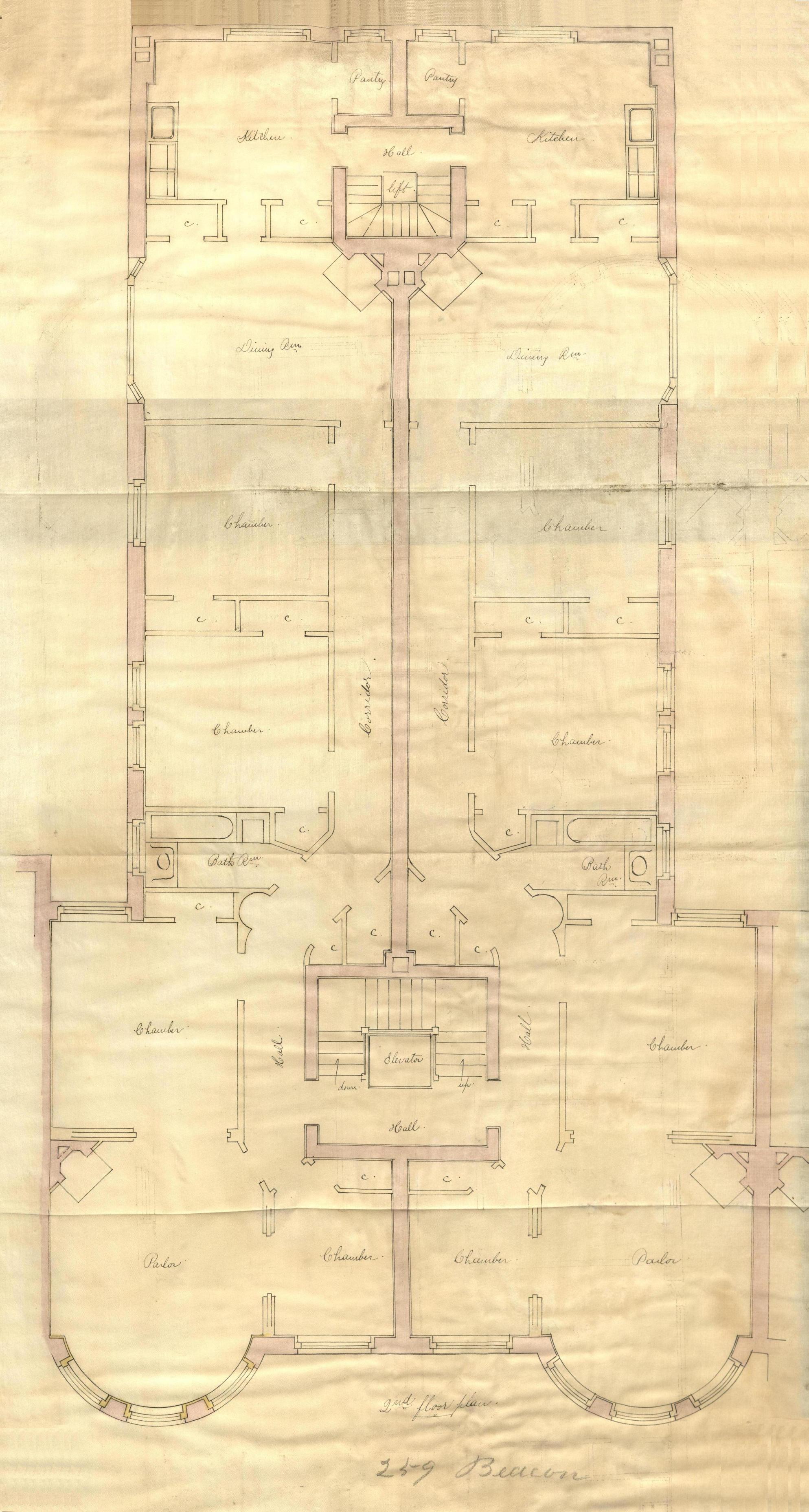 Second floor plan of 259 Beacon, bound with the final building inspection report , 30Dec1889 (v. 33, p. 114), with some water damage; Boston City Archives