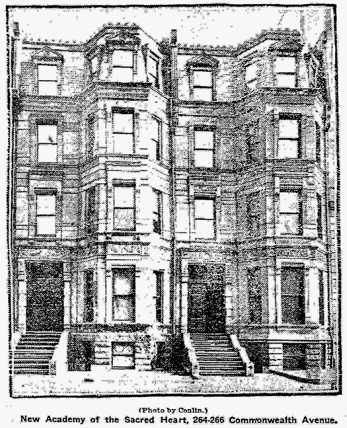 On March 7, 1907, 264 Commonwealth was purchased from Sarah Hitchcock by the Boston Academy of the Sacred Heart. It acquired 266 Commonwealth on the same day. The Academy subsequently moved its school and convent from Chester Square to 264-266 Commonwealth.