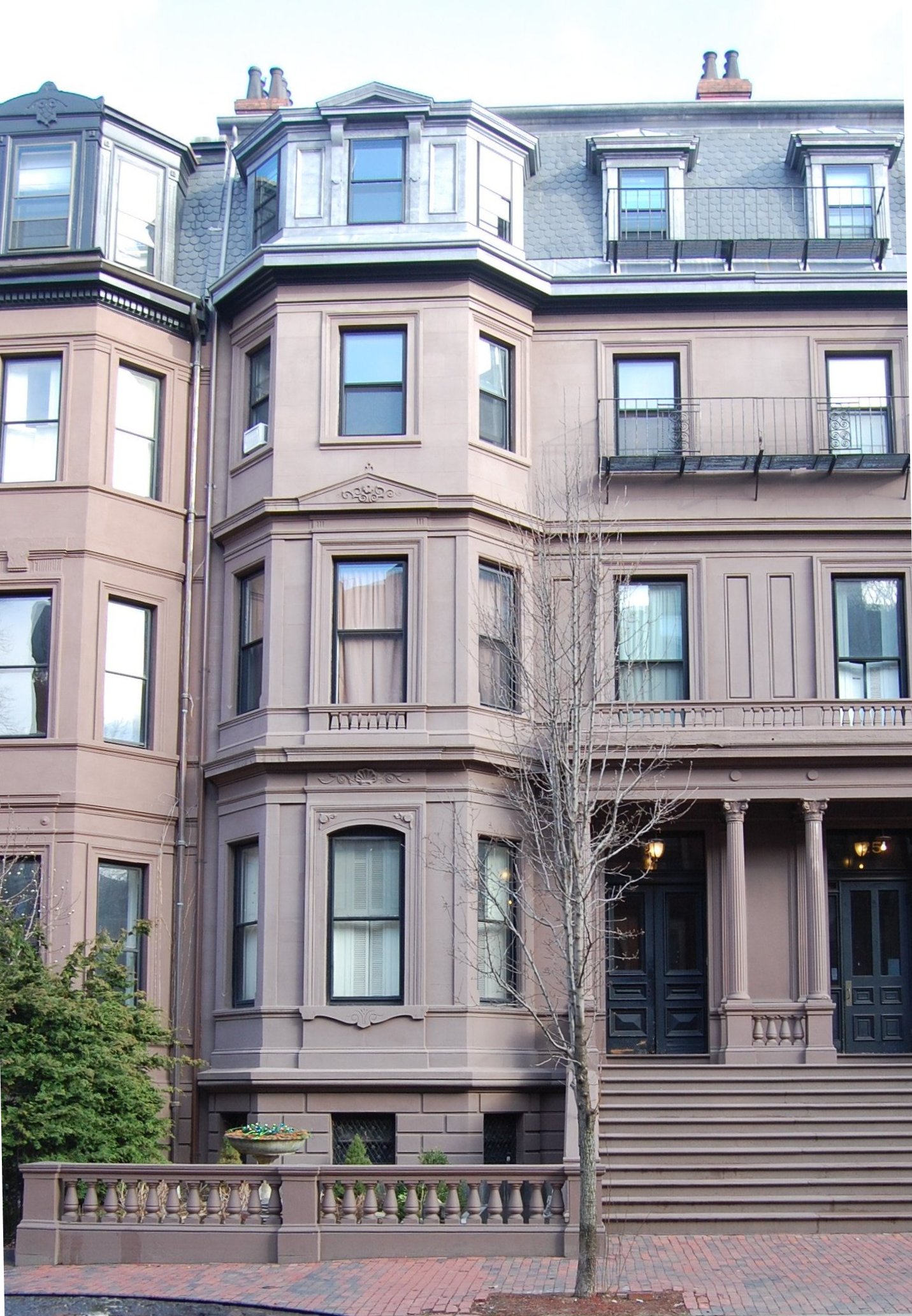 On December 5, 1866, real estate dealer Robert E. Apthorp advertised in the Boston Daily Advertiser the sale of two of the four houses at 21-27 Marlborough (the advertisement does not specify which two): “Elegant houses on Marlboro’ St. Two freestone front houses on the north side of the street, very near and in full view of the Public Garden. They are 28 feet front and built in all respects with the same thoroughness, solidity and elegance of finish as the best houses on the new land. They have dining room on same floor as parlors, and 4 chambers on 2d floor.”