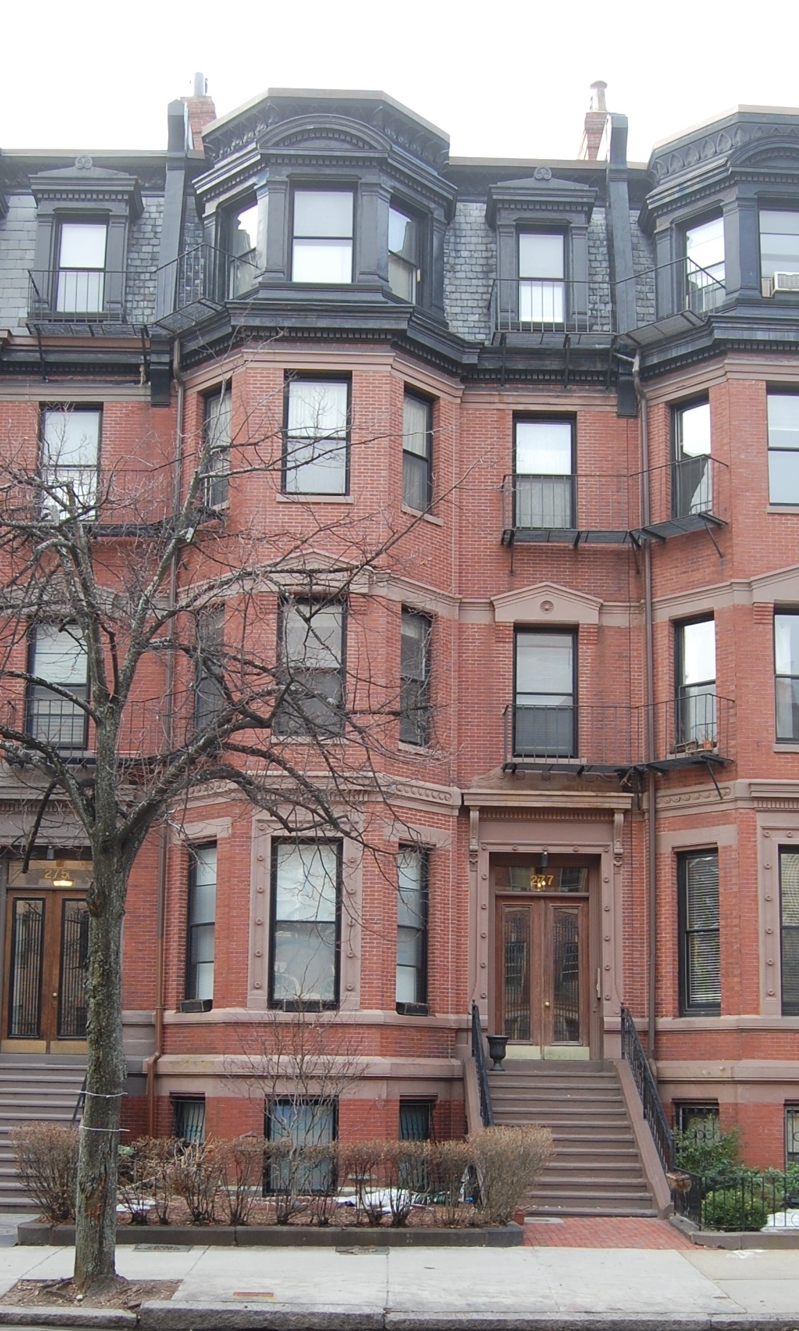 The land on which 271-281 Beacon were built was purchased by Charles W. Freeland from the Commonwealth of Massachusetts in several parcels: Four 25 foot wide lots to the east on May 26, 1874, and a 50 foot wide lot to the west on October 30, 1877. 271 Beacon is 26 feet wide, 273-275-277-279 Beacon are each 25 feet wide, and 281 Beacon is 24 feet wide.