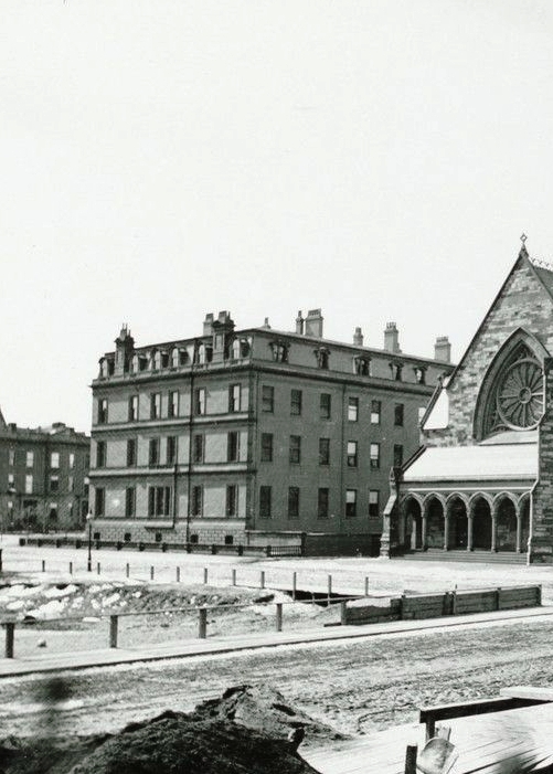 Comm 029-033 (ca 1869) 1 HistNE ← Previous Next → 29-31-33 Commonwealth, Berkeley and alley façades (ca. 1869); detail from photograph of First Church Boston, courtesy of Historic New England