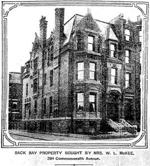 On December 28, 1904, 284 Commonwealth was purchased from Sarah Potter’s estate by Bessie (Pardee) van Wickle McKee, the wife of wholesale shoe and boot merchant William Leander McKee. They previously had lived at 1 Gloucester. Bessie van Wickle was the widow of Augustus Stout van Wickle, a Pennsylvania coal operator and bank president. Her daughters from her first marriage, Marjorie Randolph van Wickle and Augustine van Wickle, lived with them.
