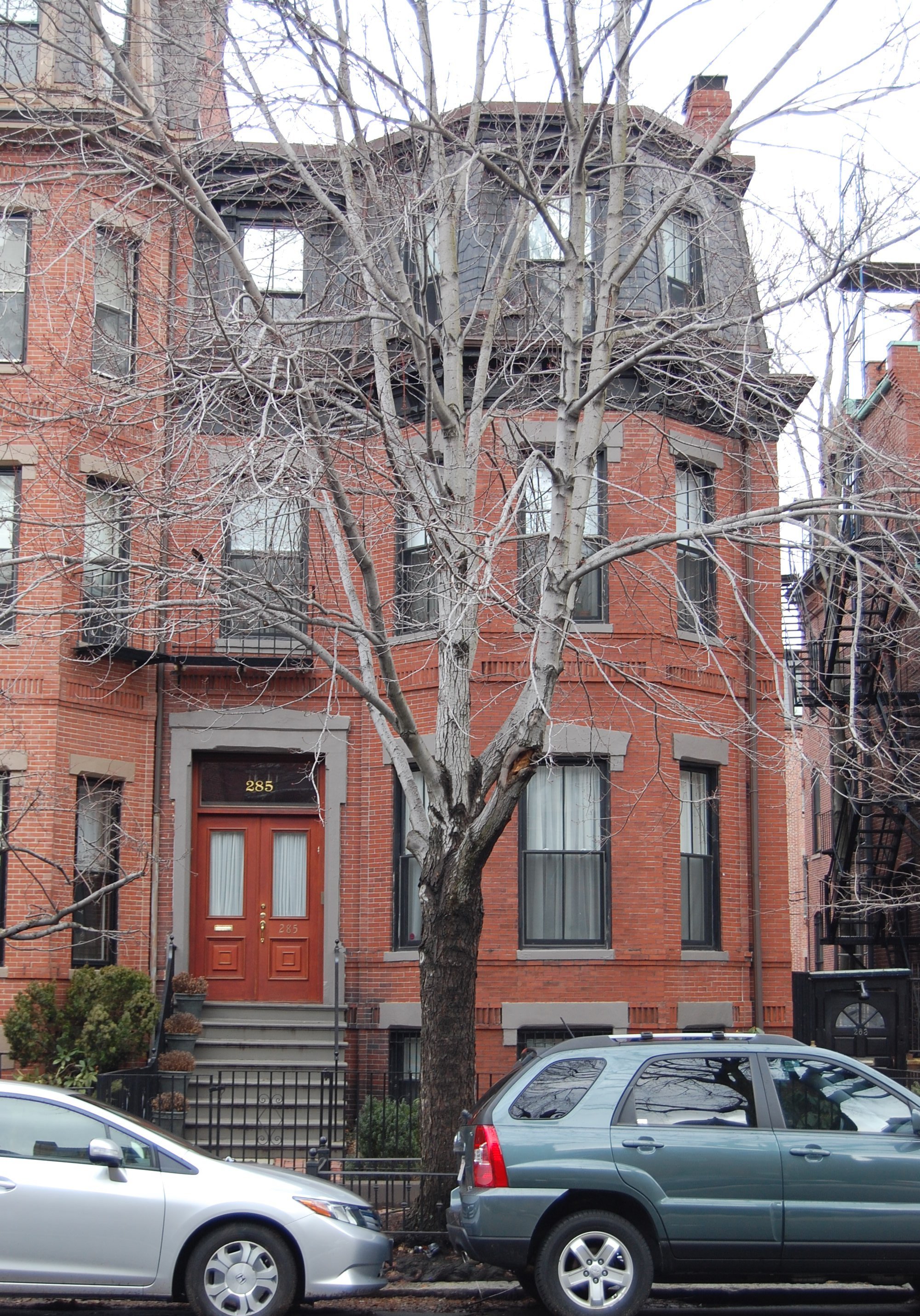 285 Marlborough was designed and built ca. 1871 by Frederick Pope for speculative sale, one of eight contiguous houses (285-287-289-291-293-295-297-299 Marlborough) built at about the same time.