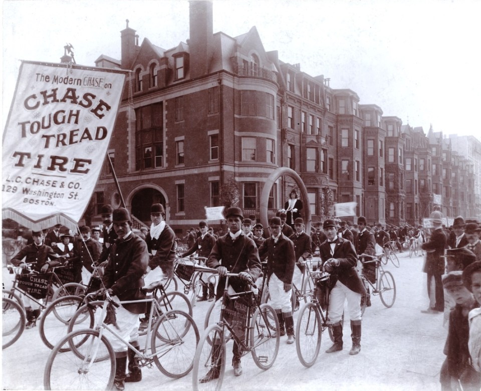 Fair 029 – 1896-08-29 – Bicycle Parade – HistNE ← Previous Next → Bicyclists on Commonwealth at Fairfield, with 29 Fairfield in the background, looking west along Commonwealth; Boston Herald Bicycle Parade, 29Aug1896; courtesy of Historic New England