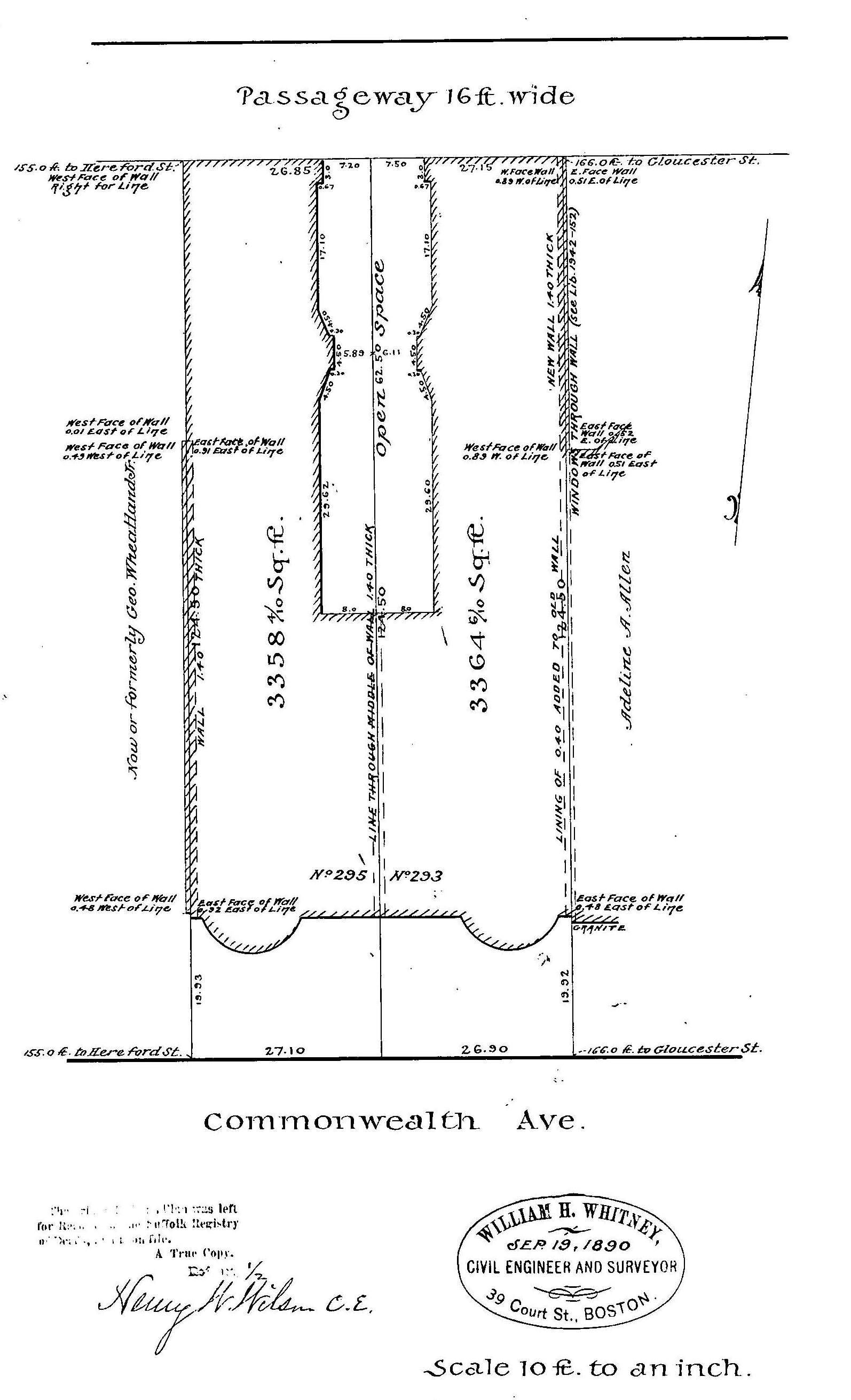Plan of 293-295 Commonwealth, drawn by William H. Whitney, 19Sep1890; Suffolk Co. Deed Registry, Book 1959., p. 55