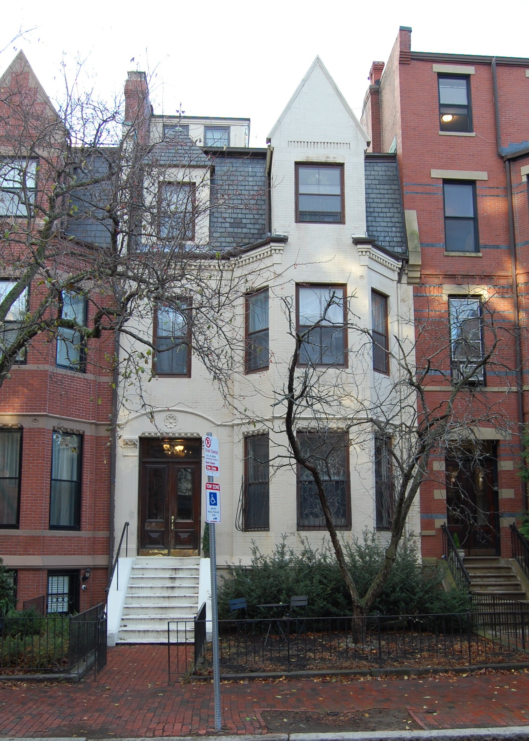 At about the same time as he designed 294-296 Marlborough, Edgar A. P. Newcomb also designed two houses for James B. Ames across the street, at 301–303 Marlborough, with similar distinctive peaked roofs on the bays.